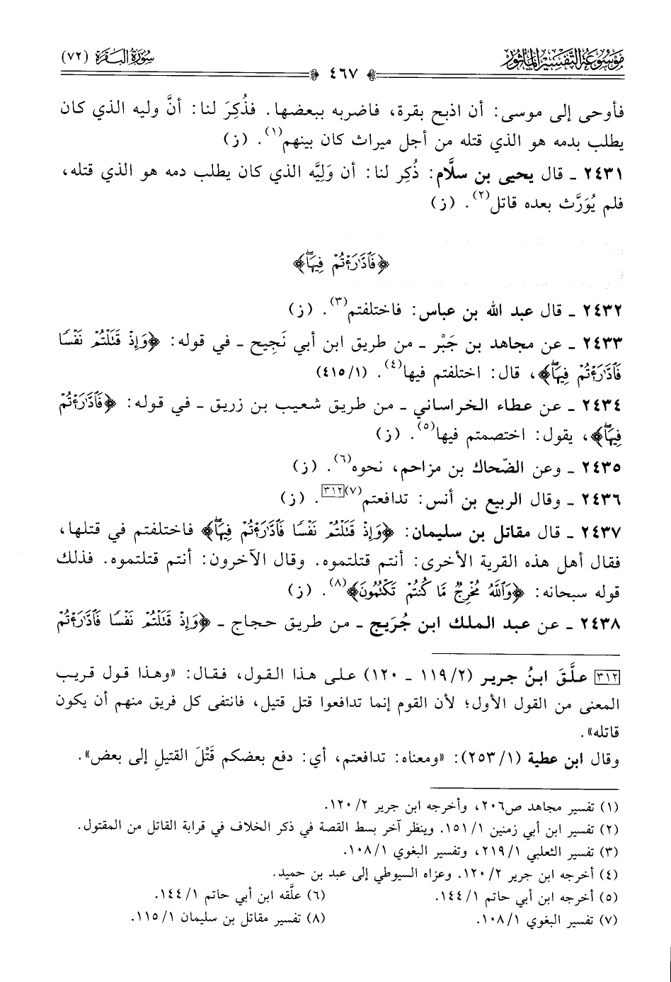 ٢٤٣٣ - عن مجاهد بن جَبْر -من طريق ابن أبي نَجِيح- في قوله: {وإذ قتلتم نفسا فادارأتم فيها}، قال: اختلفتم فيها (¬٤). (١/ ٤١٥)