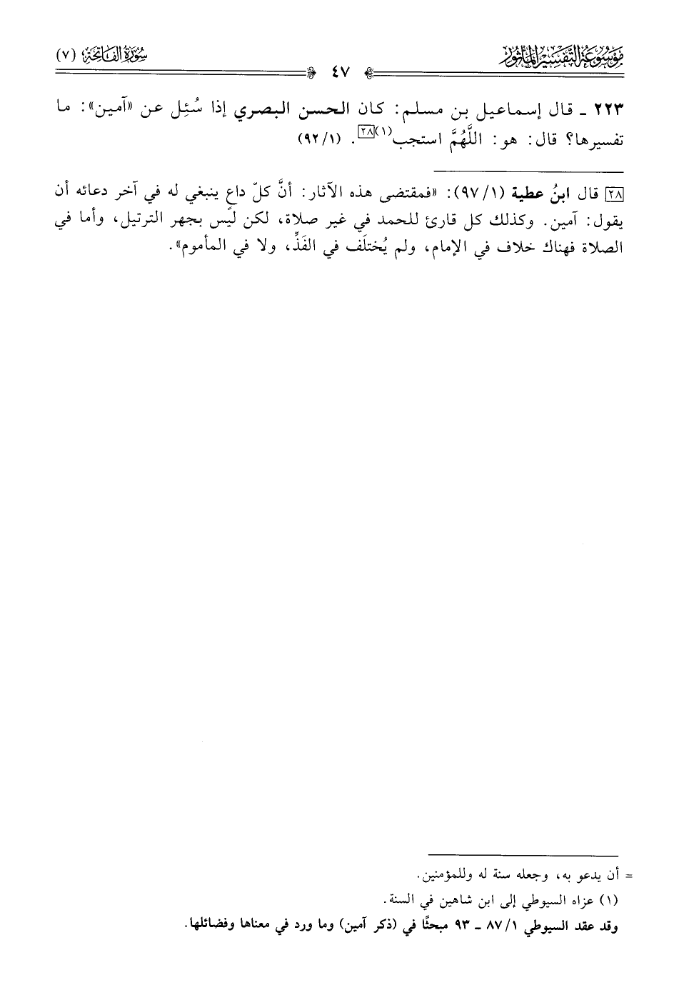 (¬١) عزاه السيوطي إلى ابن شاهين في السنة. وقد عقد السيوطي ١/ ٨٧ - ٩٣ مبحثًا في (ذكر آمين) وما ورد في معناها وفضائلها.