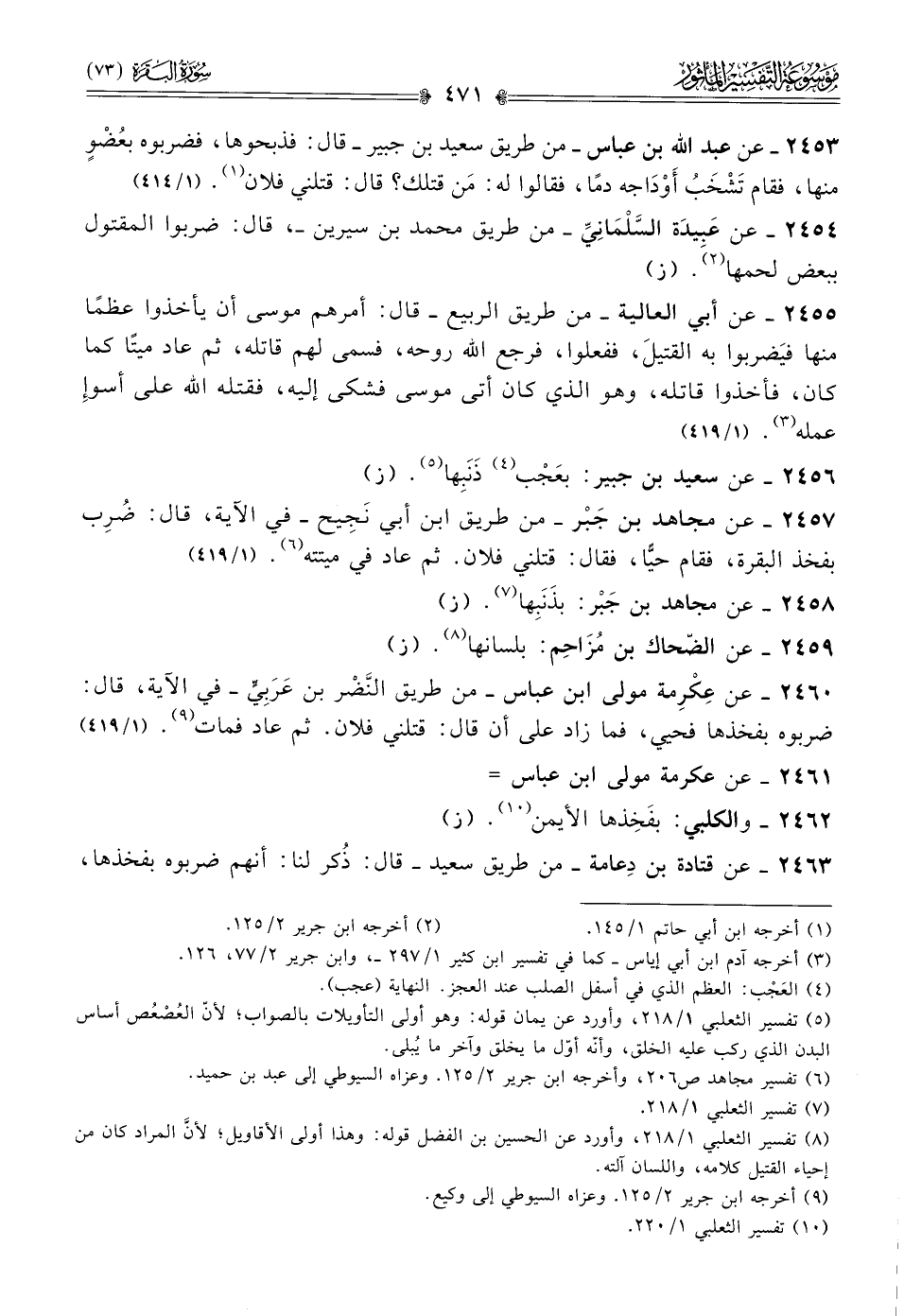 ٢٤٥٣ - عن عبد الله بن عباس -من طريق سعيد بن جبير- قال: فذبحوها، فضربوه بعُضْوٍ منها، فقام تَشْخَبُ أوْداجه دمًا، فقالوا له: مَن قتلك؟ قال: قتلني فلان (¬١). (١/ ٤١٤)