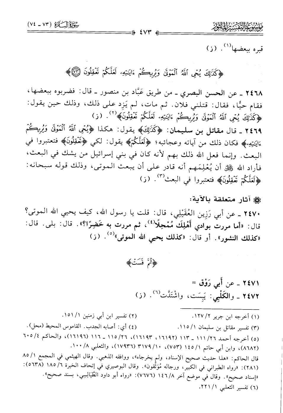 ٢٤٦٨ - عن الحسن البصري -من طريق عَبّاد بن منصور- قال: فضربوه ببعضها، فقام حيًّا، فقال: قتلني فلان. ثم مات، لم يَزِد على ذلك، وذلك حين يقول: {كذلك يحيي الله الموتى ويريكم آياته لعلكم تعقلون} (¬٢). (ز)