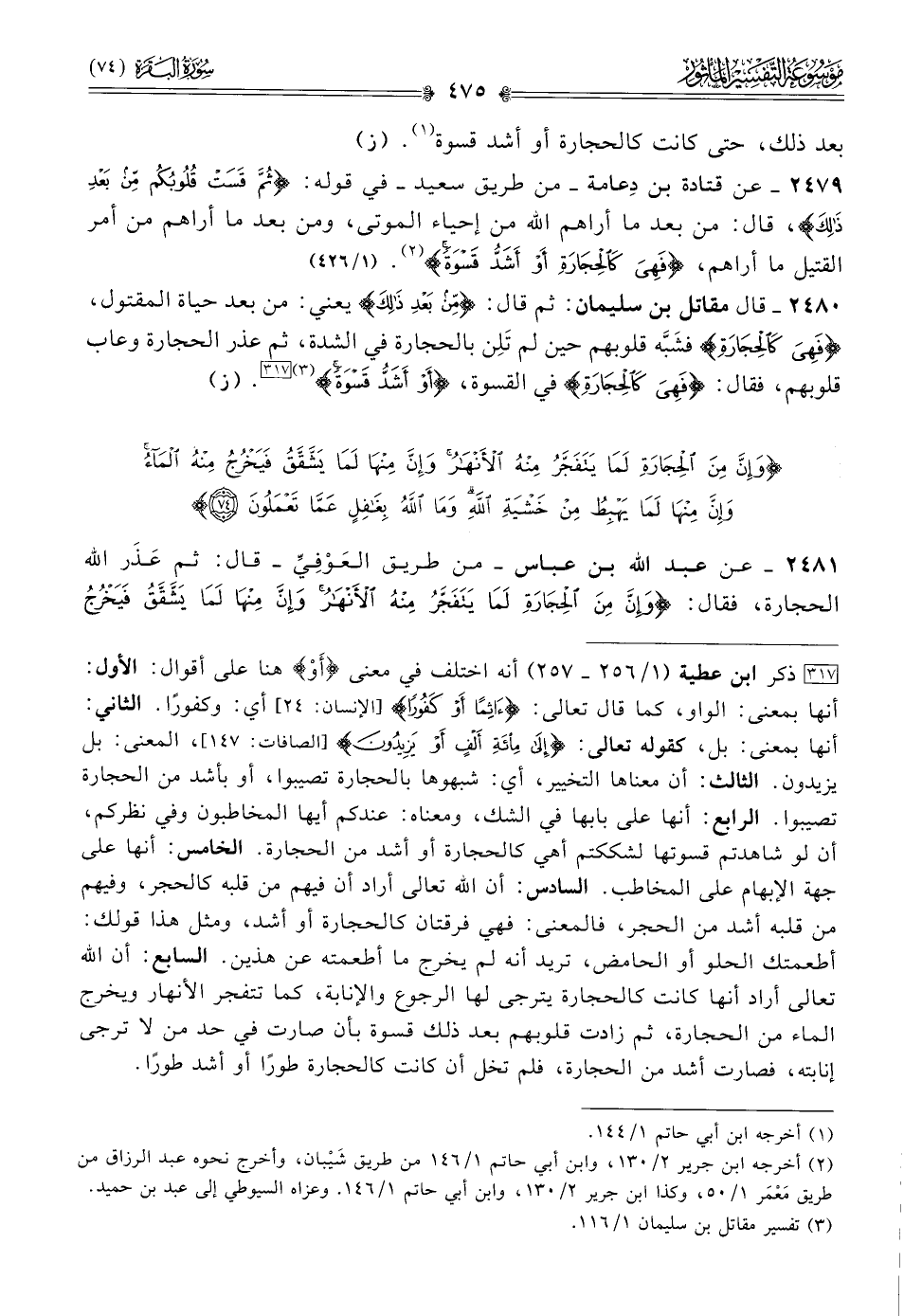 ٢٤٧٩ - عن قتادة بن دِعامة -من طريق سعيد- في قوله: {ثم قست قلوبكم من بعد ذلك}، قال: من بعد ما أراهم الله من إحياء الموتى، ومن بعد ما أراهم من أمر القتيل ما أراهم، {فهي كالحجارة أو أشد قسوة} (¬٢). (١/ ٤٢٦)