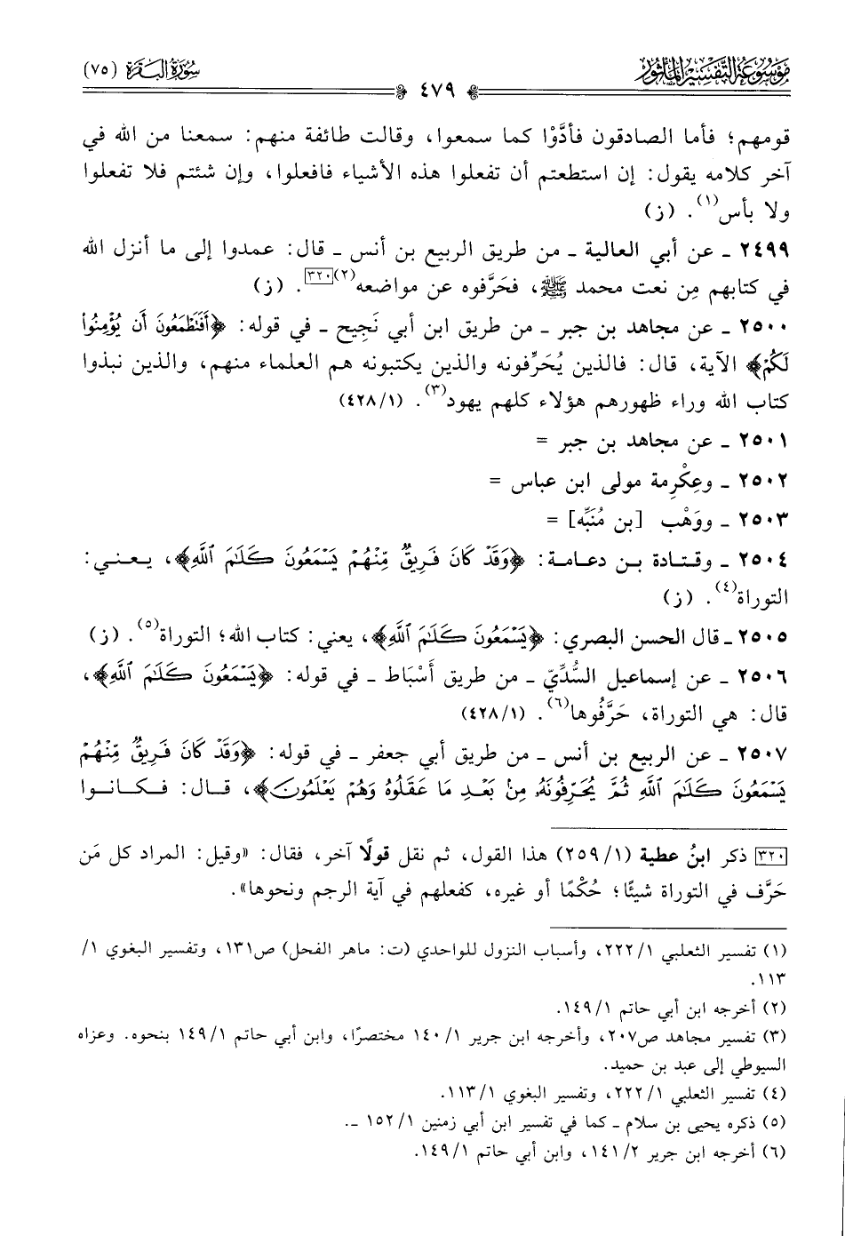 ٢٥٠٦ - عن إسماعيل السُّدِّيّ -من طريق أسْباط- في قوله: {يسمعون كلام الله}، قال: هي التوراة، حَرَّفُوها (¬٦). (١/ ٤٢٨)