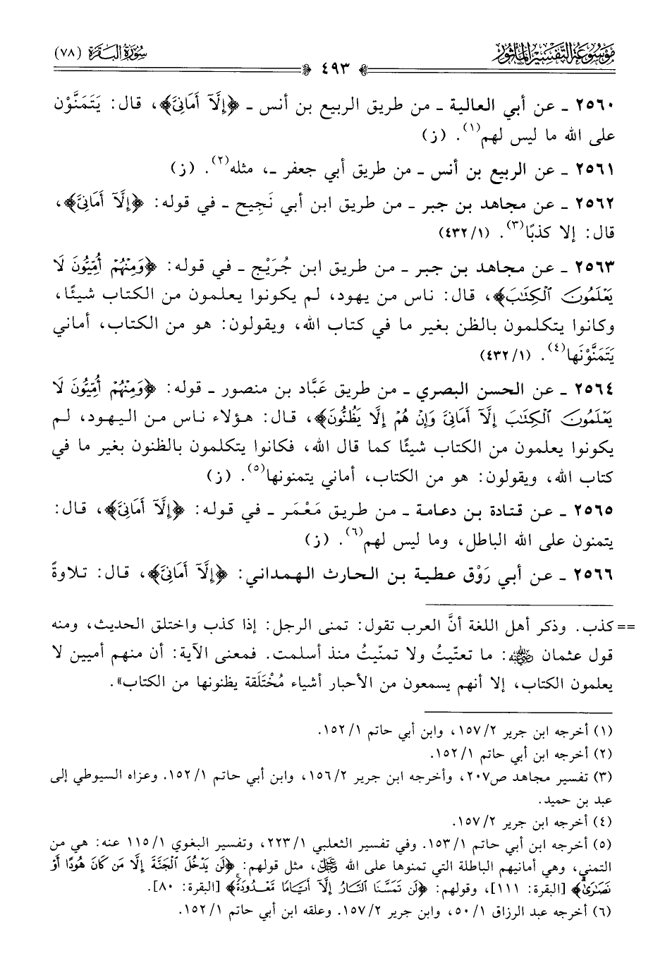 ٢٥٦٣ - عن مجاهد بن جبر -من طريق ابن جُرَيْج- في قوله: {ومنهم أميون لا يعلمون الكتاب}، قال: ناس من يهود، لم يكونوا يعلمون من الكتاب شيئًا، وكانوا يتكلمون بالظن بغير ما في كتاب الله، ويقولون: هو من الكتاب، أماني يَتَمَنَّوْنَها (¬٤).