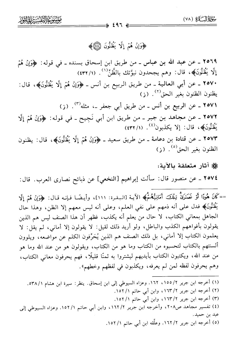 ٢٥٦٩ - عن عبد الله بن عباس -من طريق ابن إسحاق بسنده- في قوله: {وإن هم إلا يظنون}، قال: وهم يجحدون نبوَّتك بالظَّنِّ (¬١). (١/ ٤٣٢)