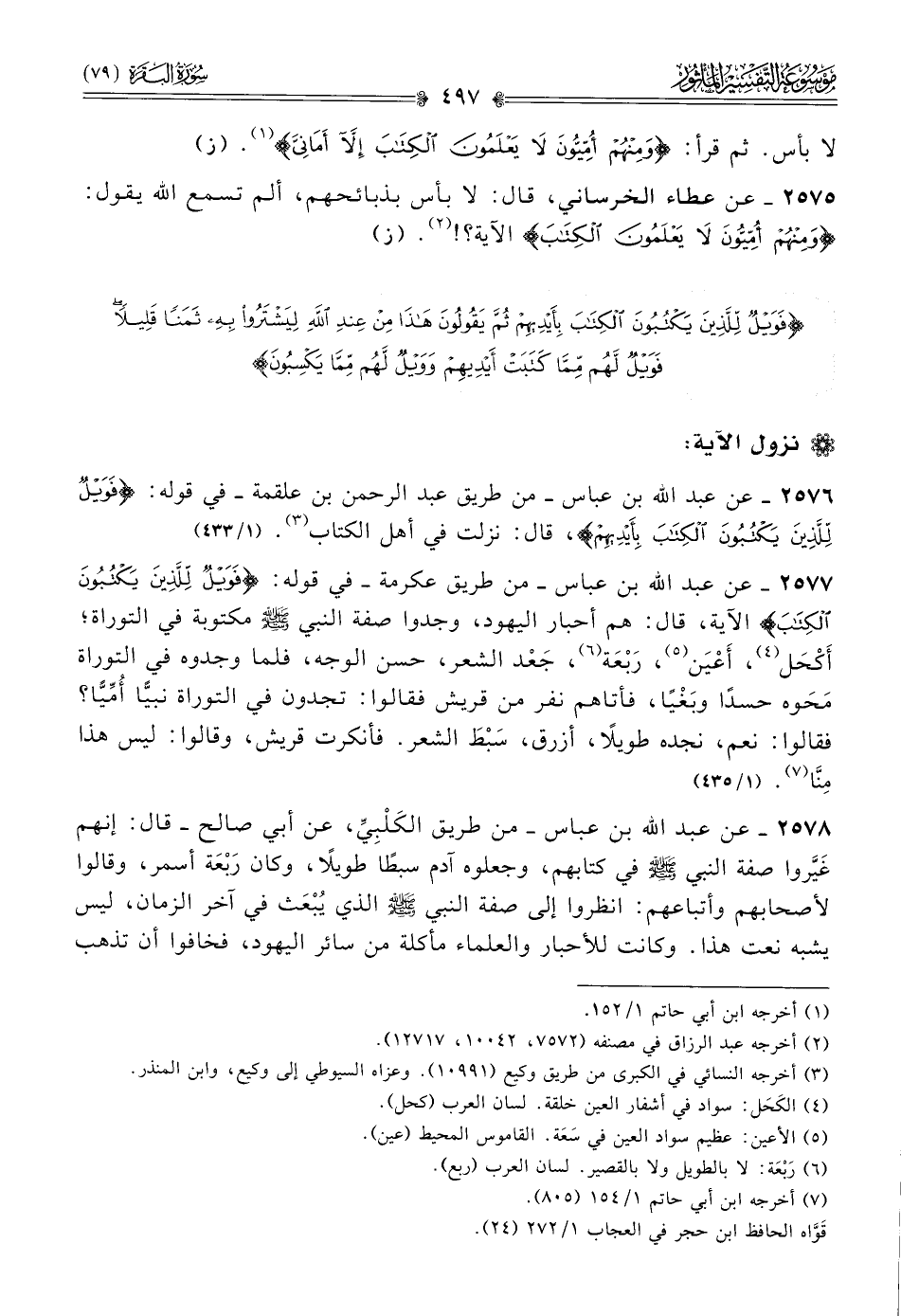 ٢٥٧٦ - عن عبد الله بن عباس -من طريق عبد الرحمن بن علقمة- في قوله: {فويل للذين يكتبون الكتاب بأيديهم}، قال: نزلت في أهل الكتاب (¬٣). (١/ ٤٣٣)