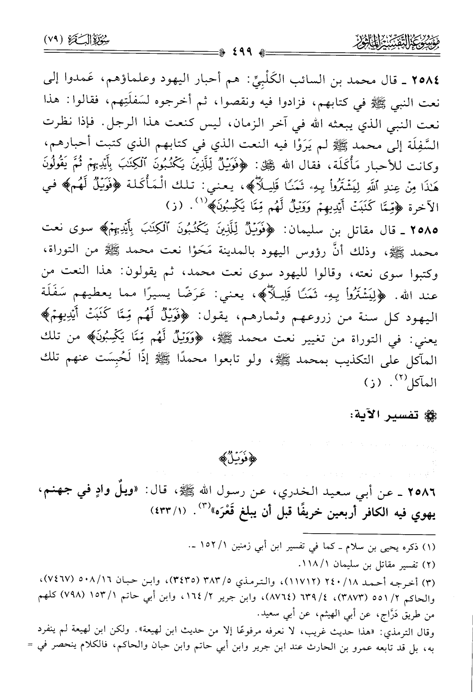 ٢٥٨٥ - قال مقاتل بن سليمان: {فويل للذين يكتبون الكتاب بأيديهم} سوى نعت محمد - صلى الله عليه وسلم -، وذلك أنّ رؤوس اليهود بالمدينة مَحَوْا نعت محمد - صلى الله عليه وسلم - من التوراة، وكتبوا سوى نعته، وقالوا لليهود سوى نعت محمد، ثم يقولون: هذا النعت من عند الله. {ليشتروا به ثمنا قليلا}، يعني: عَرَضًا يسيرًا مما يعطيهم سَفَلَة اليهود كل سنة من زروعهم وثمارهم، يقول: {فويل لهم مما كتبت أيديهم} يعني: في التوراة من تغيير نعت محمد - صلى الله عليه وسلم -، {وويل لهم مما يكسبون} من تلك المآكل على التكذيب بمحمد - صلى الله عليه وسلم -، ولو تابعوا محمدًا - صلى الله عليه وسلم - إذًا لَحُبِسَت عنهم تلك المآكل (¬٢). (ز)