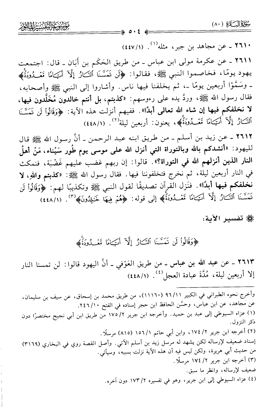 ٢٦١١ - عن عكرمة مولى ابن عباس -من طريق الحَكَم بن أبان- قال: اجتمعت يهود يومًا، فخاصموا النبي - صلى الله عليه وسلم -، فقالوا: {لن تمسنا النار إلا أياما معدودة} -وسَمَّوْا أربعين يومًا-، ثم يخلفنا فيها ناس. وأشاروا إلى النبي - صلى الله عليه وسلم - وأصحابه، فقال رسول الله - صلى الله عليه وسلم -، وردَّ يده على رءوسهم: «كذبتم، بل أنتم خالدون مُخَلَّدون فيها، لا نخلفكم فيها إن شاء الله تعالى أبدًا». ففيهم أنزلت هذه الآية: {وقالوا لن تمسنا النار إلا أياما معدودة}، يعنون: أربعين ليلة (¬٢). (١/ ٤٤٨)