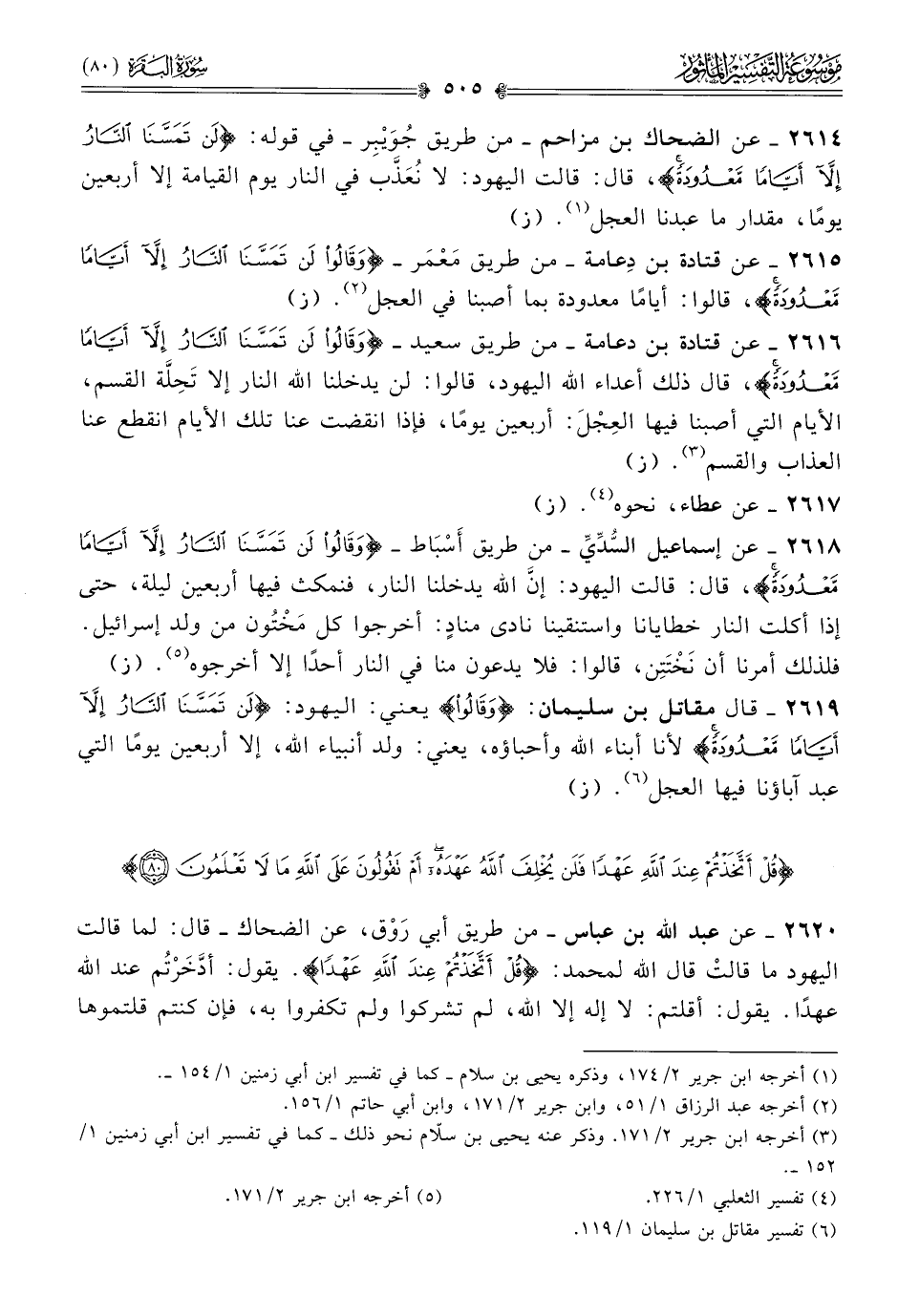 ٢٦١٤ - عن الضحاك بن مزاحم -من طريق جُوَيْبِر- في قوله: {لن تمسنا النار إلا أياما معدودة}، قال: قالت اليهود: لا نُعَذَّب في النار يوم القيامة إلا أربعين يومًا، مقدار ما عبدنا العجل (¬١). (ز)