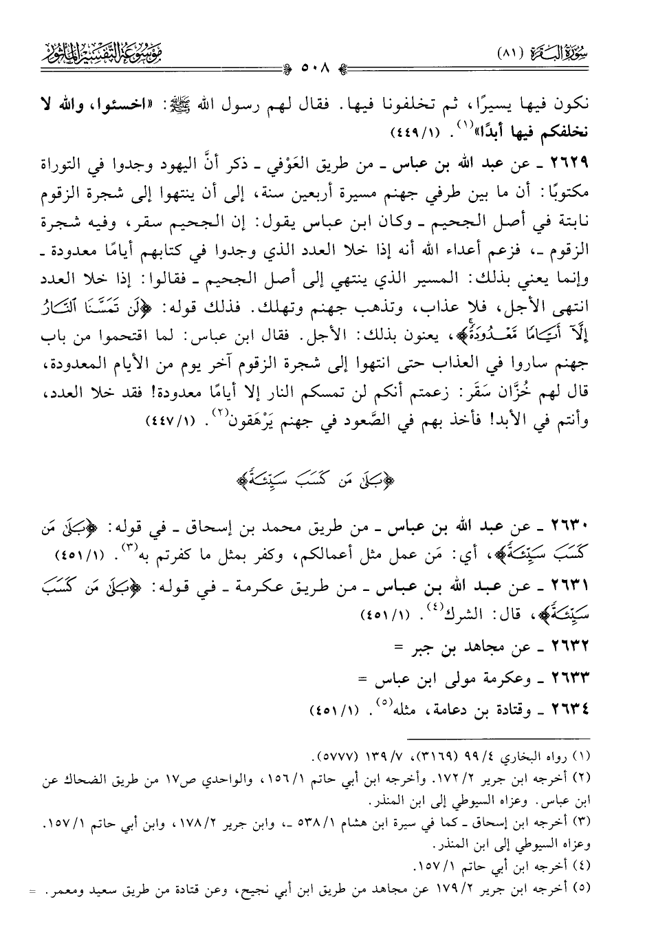 ٢٦٢٩ - عن عبد الله بن عباس -من طريق العَوْفي- ذكر أنّ اليهود وجدوا في التوراة مكتوبًا: أن ما بين طرفي جهنم مسيرة أربعين سنة، إلى أن ينتهوا إلى شجرة الزقوم نابتة في أصل الجحيم -وكان ابن عباس يقول: إن الجحيم سقر، وفيه شجرة الزقوم-، فزعم أعداء الله أنه إذا خلا العدد الذي وجدوا في كتابهم أيامًا معدودة -وإنما يعني بذلك: المسير الذي ينتهي إلى أصل الجحيم- فقالوا: إذا خلا العدد انتهى الأجل، فلا عذاب، وتذهب جهنم وتهلك. فذلك قوله: {لن تمسنا النار إلا أياما معدودة}، يعنون بذلك: الأجل. فقال ابن عباس: لما اقتحموا من باب جهنم ساروا في العذاب حتى انتهوا إلى شجرة الزقوم آخر يوم من الأيام المعدودة، قال لهم خُزّان سَقَر: زعمتم أنكم لن تمسكم النار إلا أيامًا معدودة! فقد خلا العدد، وأنتم في الأبد! فأخذ بهم في الصَّعود في جهنم يَرْهَقون (¬٢). (١/ ٤٤٧)