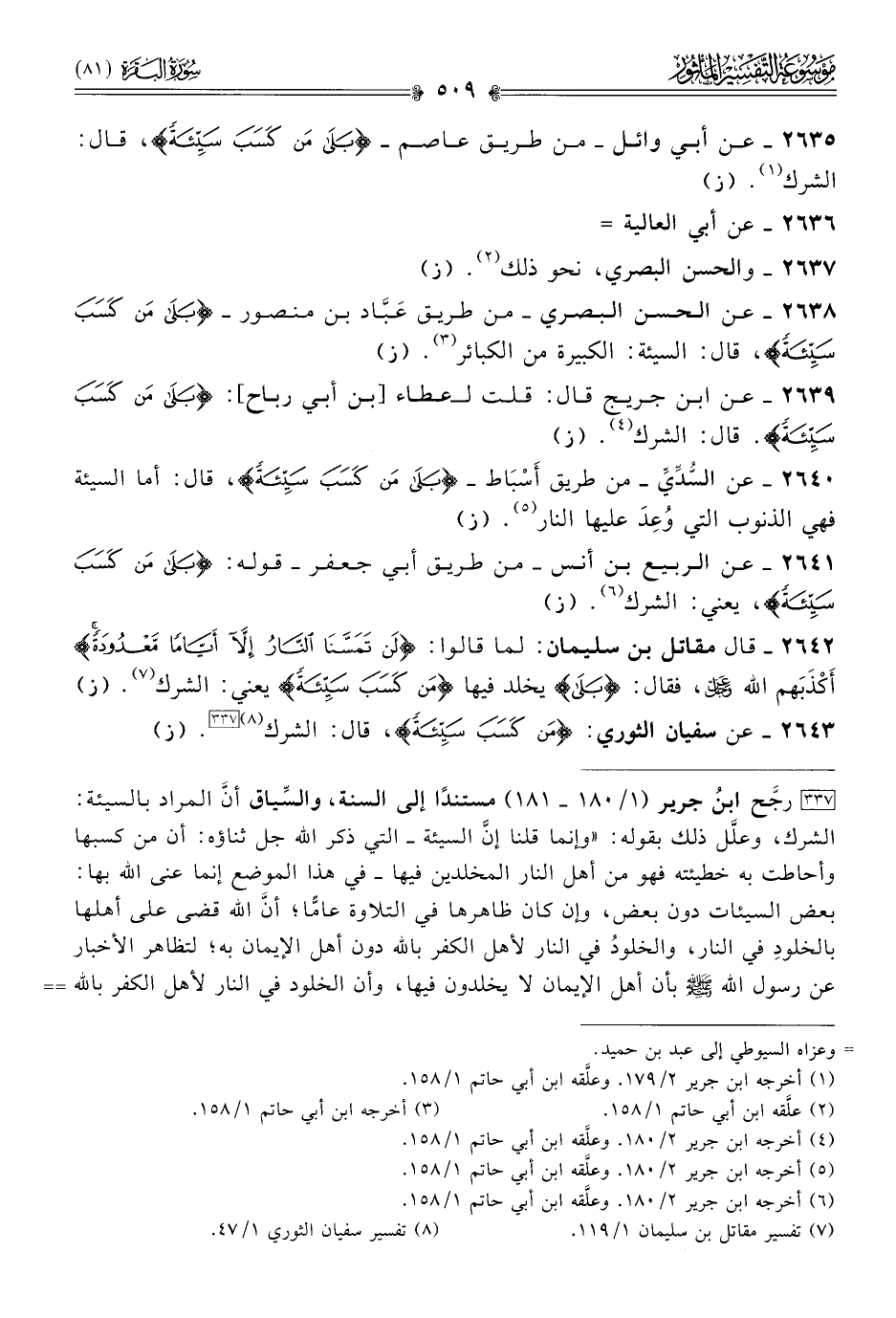 ٢٦٤٣ - عن سفيان الثوري: {من كسب سيئة}، قال: الشرك (¬٨) [٣٣٧]. (ز)