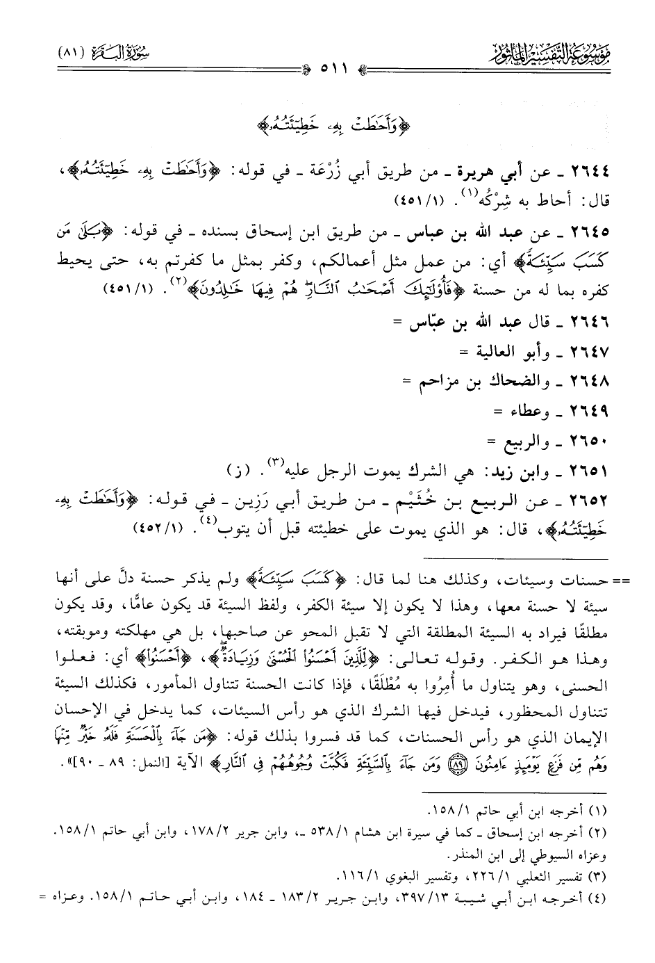 ٢٦٤٤ - عن أبي هريرة -من طريق أبي زُرْعَة- في قوله: {وأحاطت به خطيئته}، قال: أحاط به شِرْكُه (¬١). (١/ ٤٥١)