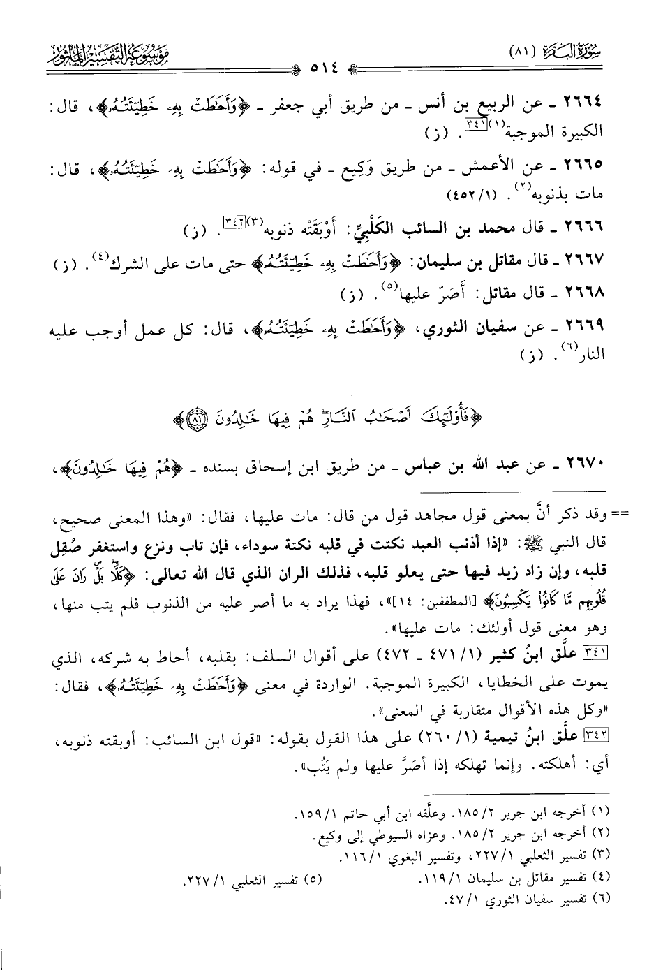 [٣٤١] علَّق ابنُ كثير (١/ ٤٧١ - ٤٧٢) على أقوال السلف: بقلبه، أحاط به شركه، الذي يموت على الخطايا، الكبيرة الموجبة. الواردة في معنى {وأحاطت به خطيئته}، فقال: «وكل هذه الأقوال متقاربة في المعنى».