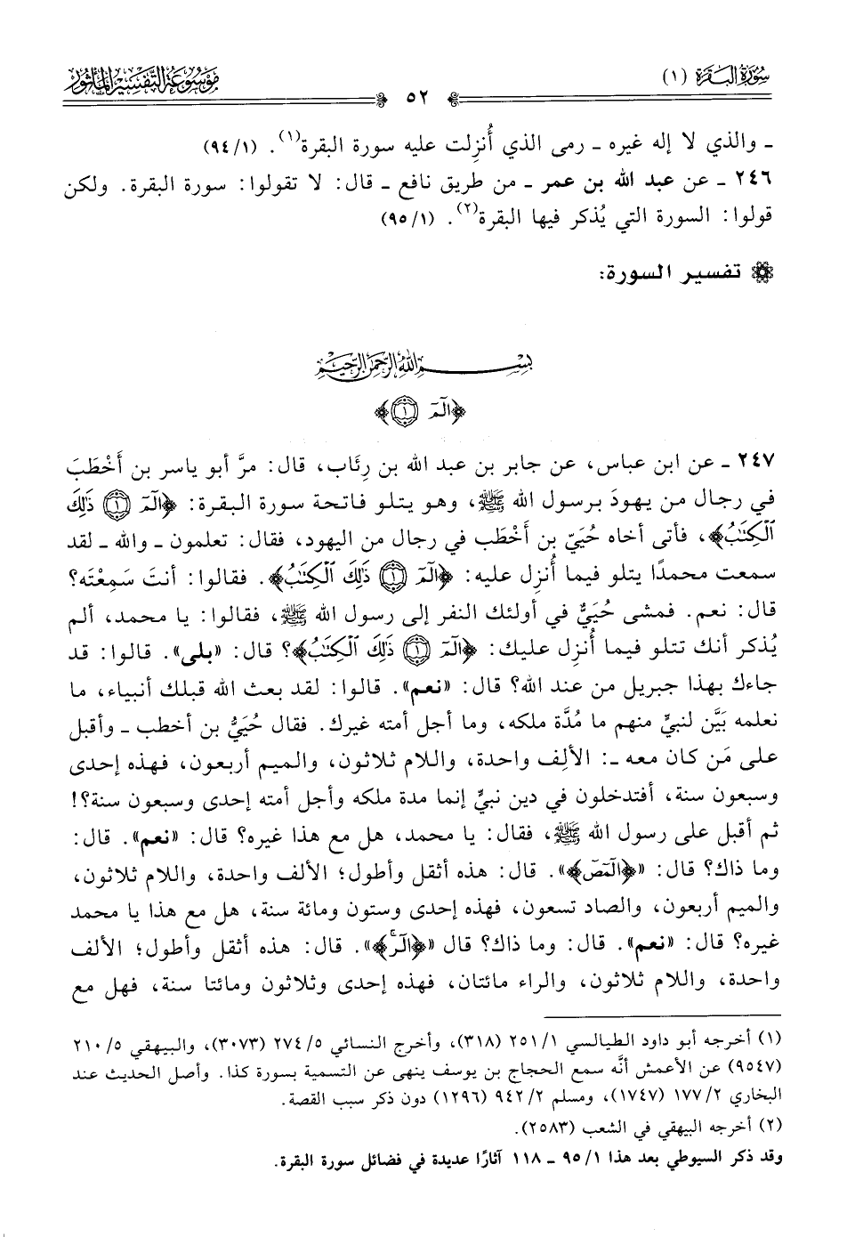 ٢٤٧ - عن ابن عباس، عن جابر بن عبد الله بن رِئاب، قال: مرَّ أبو ياسر بن أخْطَبَ في رجال من يهودَ برسول الله - صلى الله عليه وسلم -، وهو يتلو فاتحة سورة البقرة: {الم ذلك الكتاب}، فأتى أخاه حُيَيّ بن أخْطَب في رجال من اليهود، فقال: تعلمون -والله- لقد سمعت محمدًا يتلو فيما أُنزِل عليه: {الم ذلك الكتاب}. فقالوا: أنتَ سَمِعْتَه؟ قال: نعم. فمشى حُيَيٌّ في أولئك النفر إلى رسول الله - صلى الله عليه وسلم -، فقالوا: يا محمد، ألم يُذكر أنك تتلو فيما أُنزِل عليك: {الم ذلك الكتاب}؟ قال: «بلى». قالوا: قد جاءك بهذا جبريل من عند الله؟ قال: «نعم». قالوا: لقد بعث الله قبلك أنبياء، ما نعلمه بَيَّن لنبيٍّ منهم ما مُدَّة ملكه، وما أجل أمته غيرك. فقال حُيَيُّ بن أخطب -وأقبل على مَن كان معه-: الألِف واحدة، واللام ثلاثون، والميم أربعون، فهذه إحدى وسبعون سنة، أفتدخلون في دين نبيٍّ إنما مدة ملكه وأجل أمته إحدى وسبعون سنة؟! ثم أقبل على رسول الله - صلى الله عليه وسلم -، فقال: يا محمد، هل مع هذا غيره؟ قال: «نعم». قال: وما ذاك؟ قال: «{المص}». قال: هذه أثقل وأطول؛ الألف واحدة، واللام ثلاثون، والميم أربعون، والصاد تسعون، فهذه إحدى وستون ومائة سنة، هل مع هذا يا محمد غيره؟ قال: «نعم». قال: وما ذاك؟ قال «{الر}». قال: هذه أثقل وأطول؛ الألف واحدة، واللام ثلاثون، والراء مائتان، فهذه إحدى وثلاثون ومائتا سنة، فهل مع