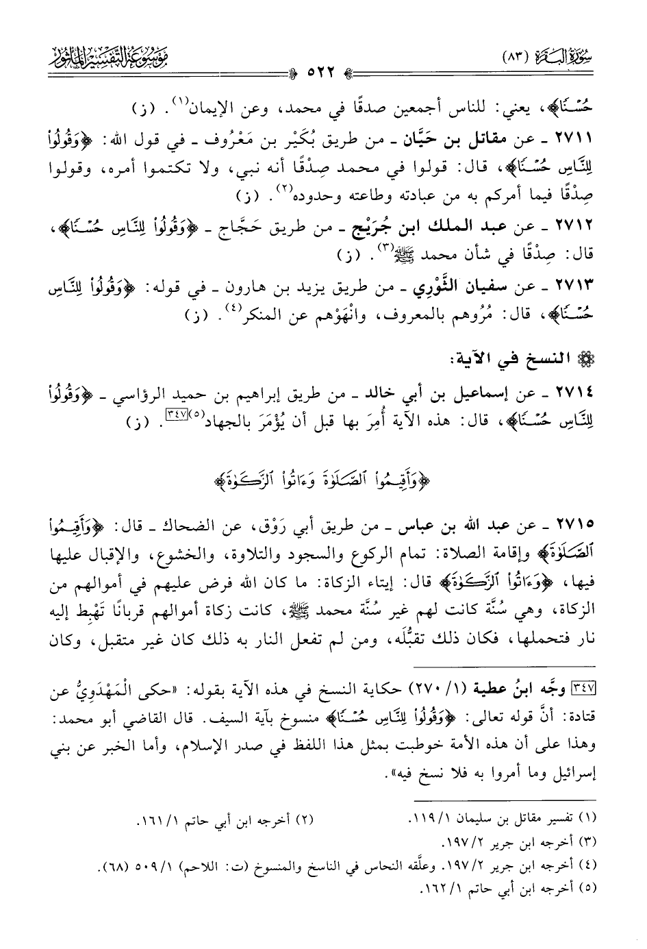 [٣٤٧] وجَّه ابنُ عطية (١/ ٢٧٠) حكاية النسخ في هذه الآية بقوله: «حكى المَهْدَوِيُّ عن قتادة: أنّ قوله تعالى: {وقُولُوا لِلنّاسِ حُسْنًا} منسوخ بآية السيف. قال القاضي أبو محمد: وهذا على أن هذه الأمة خوطبت بمثل هذا اللفظ في صدر الإسلام، وأما الخبر عن بني إسرائيل وما أمروا به فلا نسخ فيه».