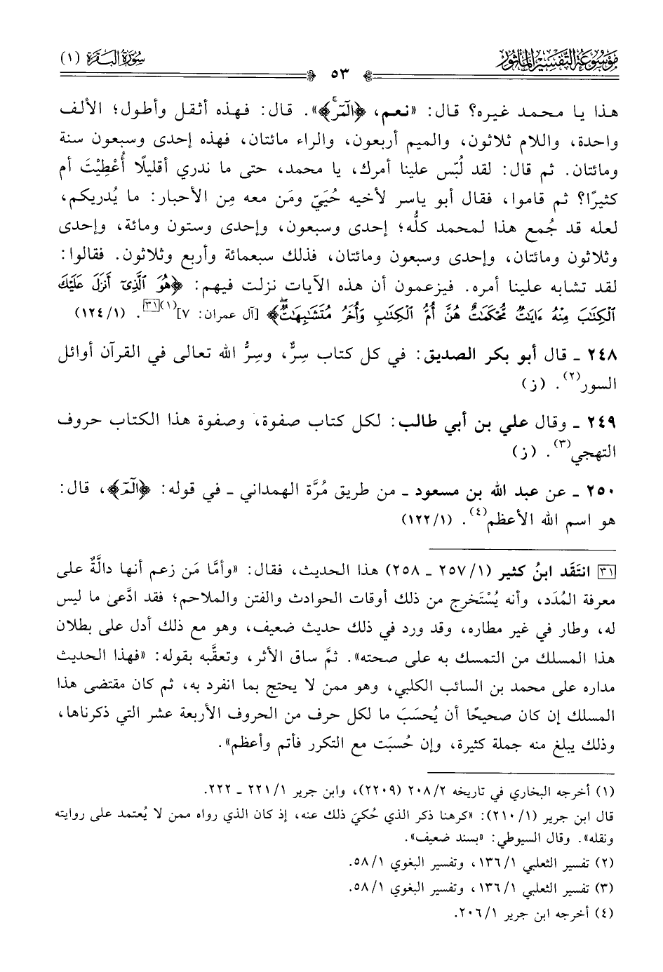 [٣١] انتَقَد ابنُ كثير (١/ ٢٥٧ - ٢٥٨) هذا الحديث، فقال: «وأمّا مَن زعم أنها دالَّةٌ على معرفة المُدَد، وأنه يُسْتَخرج من ذلك أوقات الحوادث والفتن والملاحم؛ فقد ادَّعى ما ليس له، وطار في غير مطاره، وقد ورد في ذلك حديث ضعيف، وهو مع ذلك أدل على بطلان هذا المسلك من التمسك به على صحته». ثمَّ ساق الأثر، وتعقَّبه بقوله: «فهذا الحديث مداره على محمد بن السائب الكلبي، وهو ممن لا يحتج بما انفرد به، ثم كان مقتضى هذا المسلك إن كان صحيحًا أن يُحسَبَ ما لكل حرف من الحروف الأربعة عشر التي ذكرناها، وذلك يبلغ منه جملة كثيرة، وإن حُسبَت مع التكرر فأتم وأعظم».