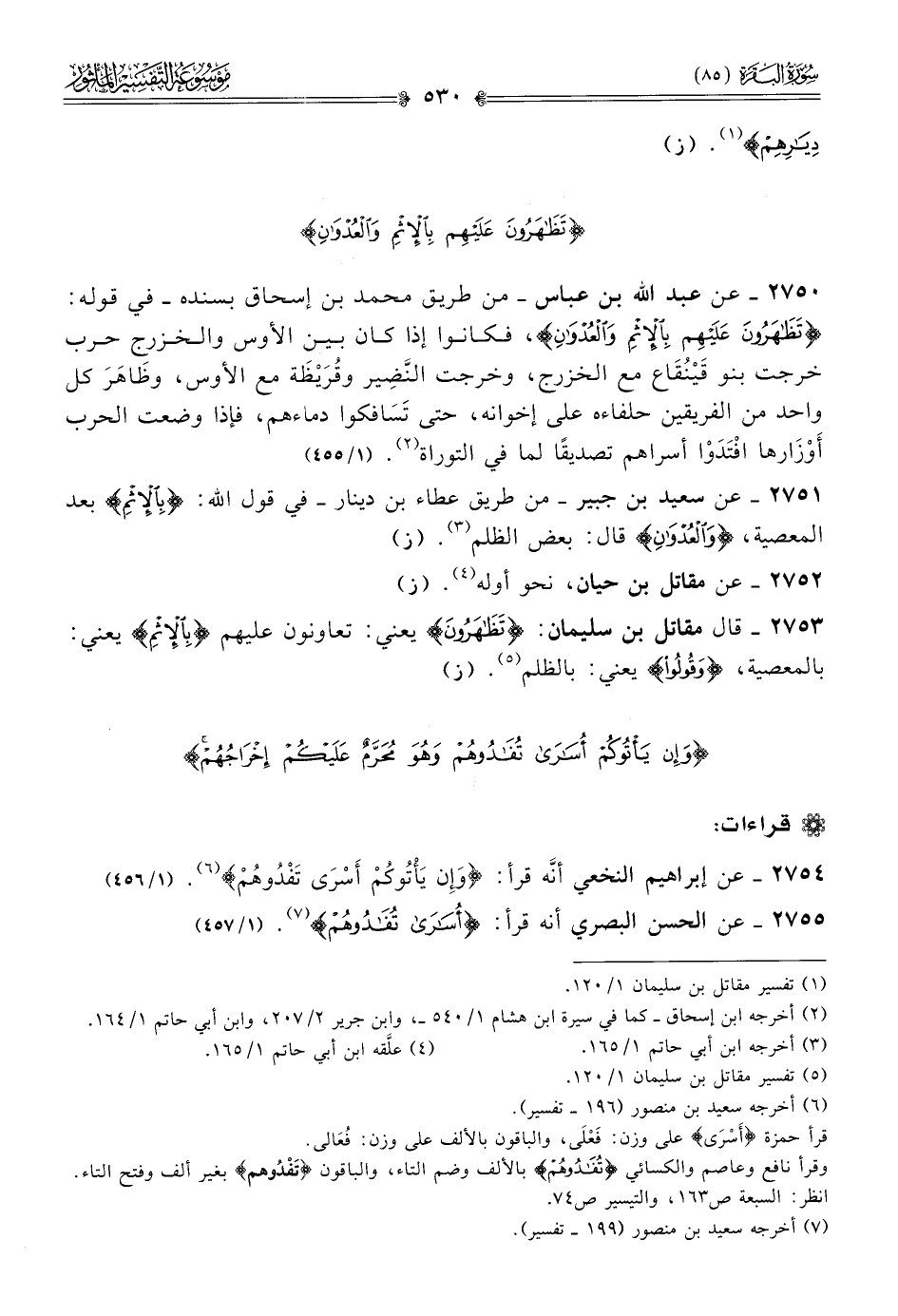 ٢٧٥٠ - عن عبد الله بن عباس -من طريق محمد بن إسحاق بسنده- في قوله: {تظاهرون عليهم بالإثم والعدوان}، فكانوا إذا كان بين الأوس والخزرج حرب خرجت بنو قَيْنُقاع مع الخزرج، وخرجت النَّضِير وقُرَيْظَة مع الأوس، وظاهَرَ كل واحد من الفريقين حلفاءه على إخوانه، حتى تَسافكوا دماءهم، فإذا وضعت الحرب أوْزارها افْتَدَوْا أسراهم تصديقًا لما في التوراة (¬٢).