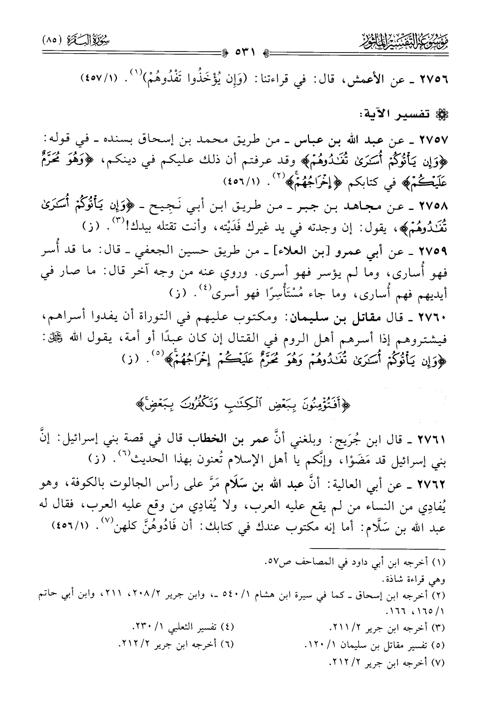 ٢٧٥٨ - عن مجاهد بن جبر -من طريق ابن أبي نَجِيح- {وإن يأتوكم أسارى تفدوهم}، يقول: إن وجدته في يد غيرك فَدَيْته، وأنت تقتله بيدك! (¬٣). (١/ ٤٥٦)