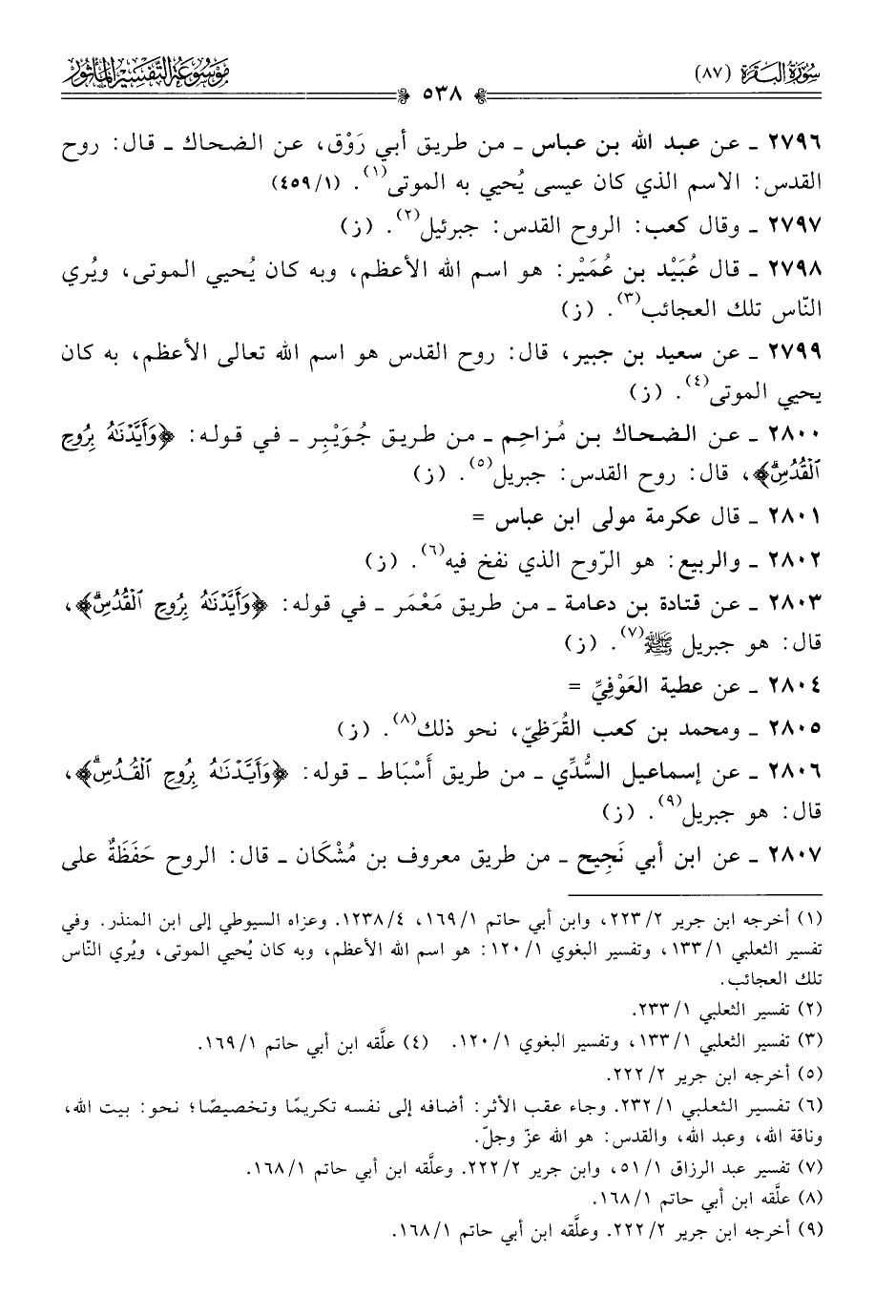 ٢٧٩٦ - عن عبد الله بن عباس -من طريق أبي رَوْق، عن الضحاك- قال: روح القدس: الاسم الذي كان عيسى يُحيي به الموتى (¬١). (١/ ٤٥٩)