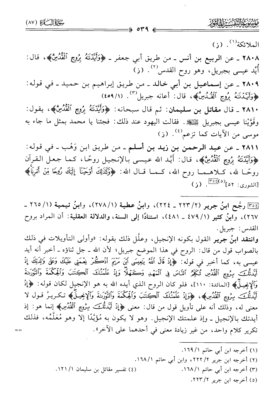[٣٥٤] رجَّح ابنُ جرير (٢/ ٢٢٣ - ٢٢٤)، وابنُ عطية (١/ ٢٧٨)، وابنُ تيمية (١/ ٢٦٥ - ٢٦٧)، وابنُ كثير (١/ ٤٧٩ - ٤٨١)، استنادًا إلى السنة، والدلالة العقلية: أن المراد بروح القدس: جبريل.
