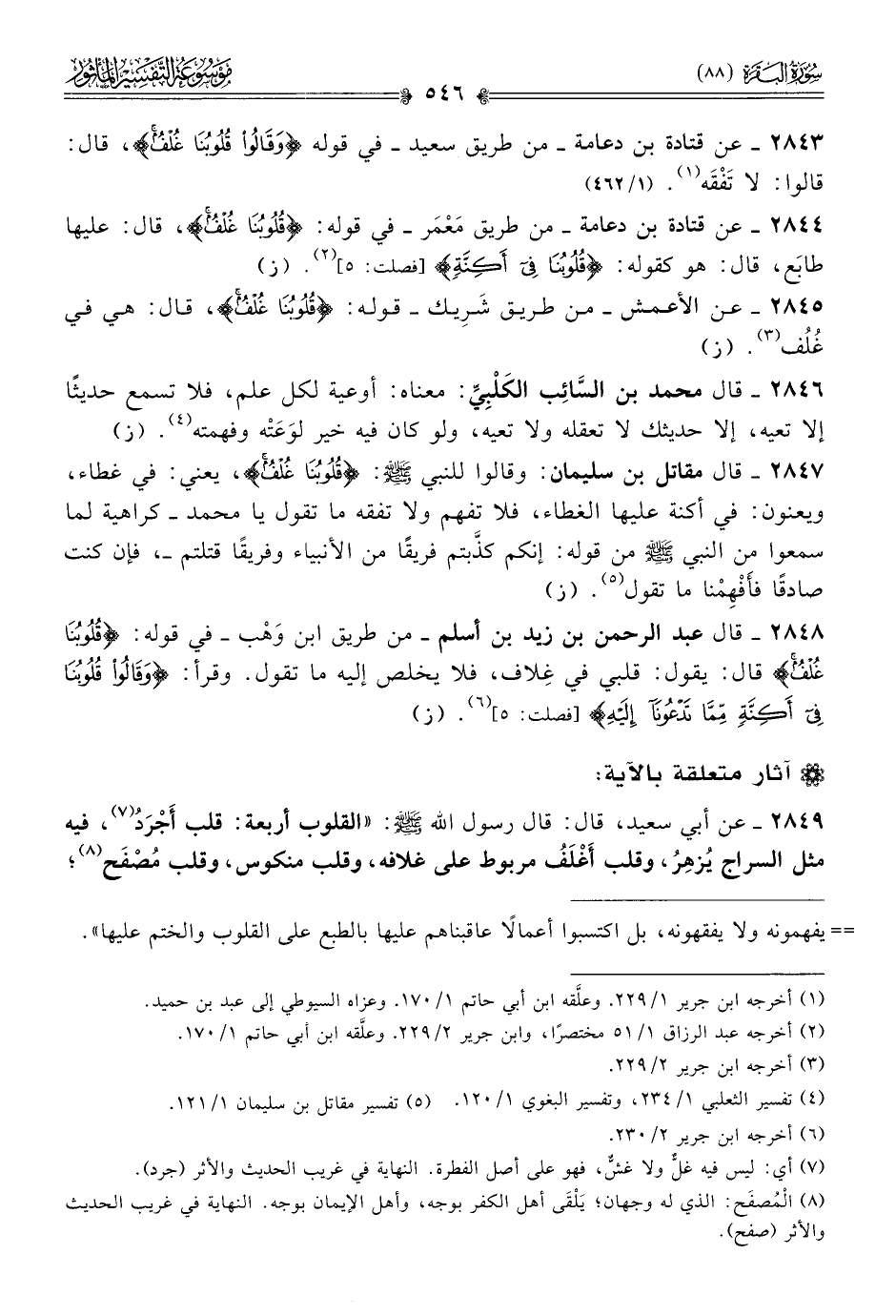 ٢٨٤٣ - عن قتادة بن دعامة -من طريق سعيد- في قوله {وقالوا قلوبنا غلف}، قال: قالوا: لا تَفْقَه (¬١). (١/ ٤٦٢)