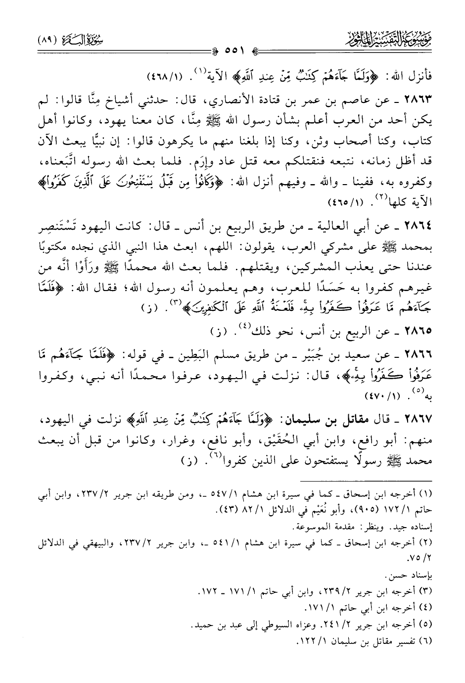 ٢٨٦٧ - قال مقاتل بن سليمان: {ولما جاءهم كتاب من عند الله} نزلت في اليهود، منهم: أبو رافع، وابن أبي الحُقَيْق، وأبو نافع، وغرار، وكانوا من قبل أن يبعث محمد - صلى الله عليه وسلم - رسولًا يستفتحون على الذين كفروا (¬٦). (ز)