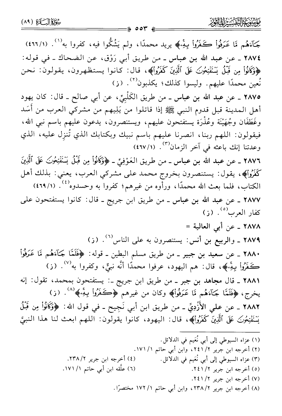 ٢٨٧٥ - عن عبد الله بن عباس -من طريق الكَلْبِيِّ، عن أبي صالح- قال: كان يهود أهل المدينة قبل قدوم النبي - صلى الله عليه وسلم - إذا قاتلوا من يَلِيهم من مشركي العرب من أسَد وغَطَفان وجُهَيْنَة وعُذْرَة يستفتحون عليهم، ويستنصرون، يدعون عليهم باسم نبي الله، فيقولون: اللهم ربنا، انصرنا عليهم باسم نبيك وبكتابك الذي تُنزِل عليه، الذي وعدتنا إنك باعثه في آخر الزمان (¬٣). (١/ ٤٦٩)