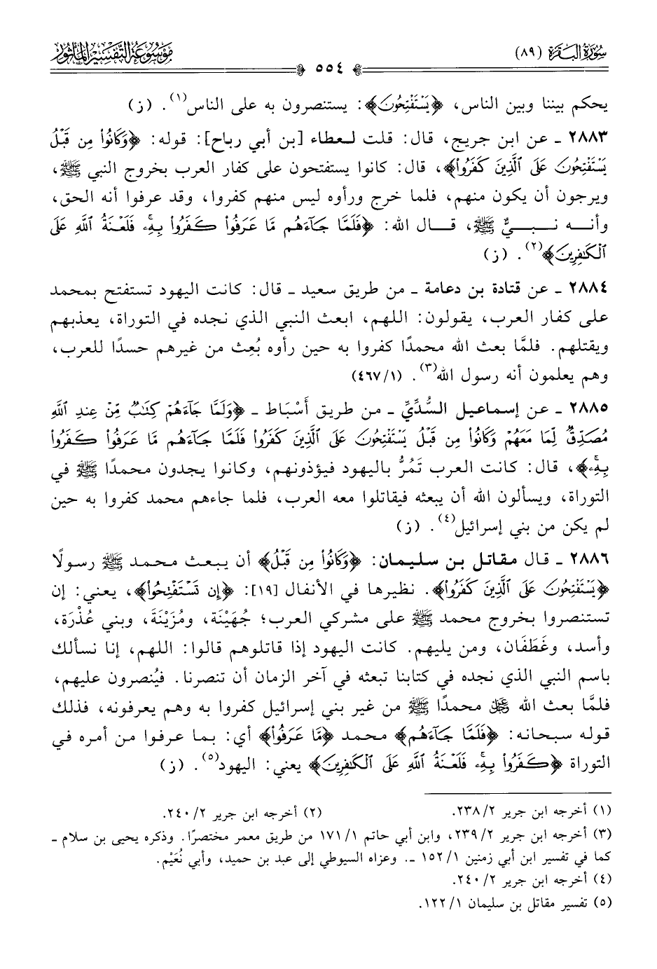 ٢٨٨٤ - عن قتادة بن دعامة -من طريق سعيد- قال: كانت اليهود تستفتح بمحمد على كفار العرب، يقولون: اللهم، ابعث النبي الذي نجده في التوراة، يعذبهم ويقتلهم. فلمّا بعث الله محمدًا كفروا به حين رأوه بُعِث من غيرهم حسدًا للعرب، وهم يعلمون أنه رسول الله (¬٣). (١/ ٤٦٧)