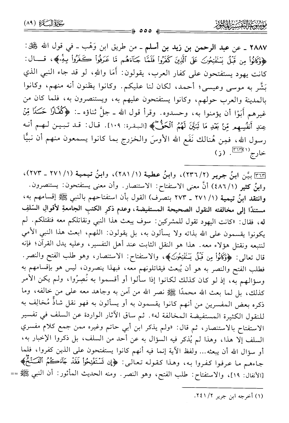 وانتقد ابنُ تيمية (١/ ٢٧١ - ٢٧٣ بتصرف) القول بأن استفتاحهم بالنبي - صلى الله عليه وسلم - إقسامهم به، مستندًا إلى مخالفته النقول الصحيحة المستفيضة، وعدم ذكرِ الكتبِ الجامعةِ لأقوالِ السّلفِ له، فقال: «كانت اليهود تقول للمشركين: سوف يبعث هذا النبي ونقاتلكم معه فنقتلكم. لم يكونوا يقسمون على الله بذاته ولا يسألون به، بل يقولون: اللهم، ابعث هذا النبي الأمي لنتبعه ونقتل هؤلاء معه. هذا هو النقل الثابت عند أهل التفسير، وعليه يدل القرآن؛ فإنه قال تعالى: {وكانُوا مِن قَبْلُ يَسْتَفْتِحُونَ}، والاستفتاح: الاستنصار، وهو طلب الفتح والنصر. فطلب الفتح والنصر به هو أن يُبعث فيقاتلونهم معه، فبهذا ينصرون، ليس هو بإقسامهم به وسؤالهم به، إذ لو كان كذلك لكانوا إذا سألوا أو أقسموا به نُصِرُوا، ولم يكن الأمر كذلك، بل لما بعث الله محمدًا - صلى الله عليه وسلم - نصر الله من آمن به وجاهد معه على من خالفه، وما ذكره بعض المفسرين من أنهم كانوا يقسمون به أو يسألون به فهو نقل شاذٌّ مُخالِف به للنقول الكثيرة المستفيضة المخالفة له». ثم ساق الآثار الواردة عن السلف في تفسير الاستفتاح بالاستنصار، ثم قال: «ولم يذكر ابن أبي حاتم وغيره ممن جمع كلام مفسري السلف إلا هذا، وهذا لم يُذكر فيه السؤال به عن أحد من السلف، بل ذكروا الإخبار به، أو سؤال الله أن يبعثه ... ولفظ الآية إنما فيه أنهم كانوا يستفتحون على الذين كفروا، فلما جاءهم ما عرفوا كفروا به، وهذا كقوله تعالى: {إنْ تَسْتَفْتِحُوا فَقَدْ جاءَكُمْ الفَتْحُ} [الأنفال: ١٩]، والاستفتاح: طلب الفتح، وهو النصر. ومنه الحديث المأثور: أن النبي - صلى الله عليه وسلم - كان يستفتح بصعاليك المهاجرين، أي: يستنصر بهم، أي: بدعائهم، كما قال: «وهل ترزقون وتنصرون إلا بضعفائكم». بصلاتهم ودعائهم وإخلاصهم. وهذا قد يكون بأن يطلبوا من الله تعالى أن ينصرهم بالنبي المبعوث في آخر الزمان، بأن يعجل بعث ذلك النبي إليهم لينتصروا به عليهم، لا لأنهم أقسموا على الله وسألوا به، ولهذا قال تعالى: {فلما جاءهم ما عرفوا كفروا به فلعنة الله على الكافرين}، فلو لم ترد الآثار التي تدل على أن هذا معنى الآية لم يجُز لأحد أن يحمل الآية على ذلك المعنى المتنازع فيه بلا دليل؛ لأنه لا دلالة فيها عليه، فكيف وقد جاءت الآثار بذلك؟!».