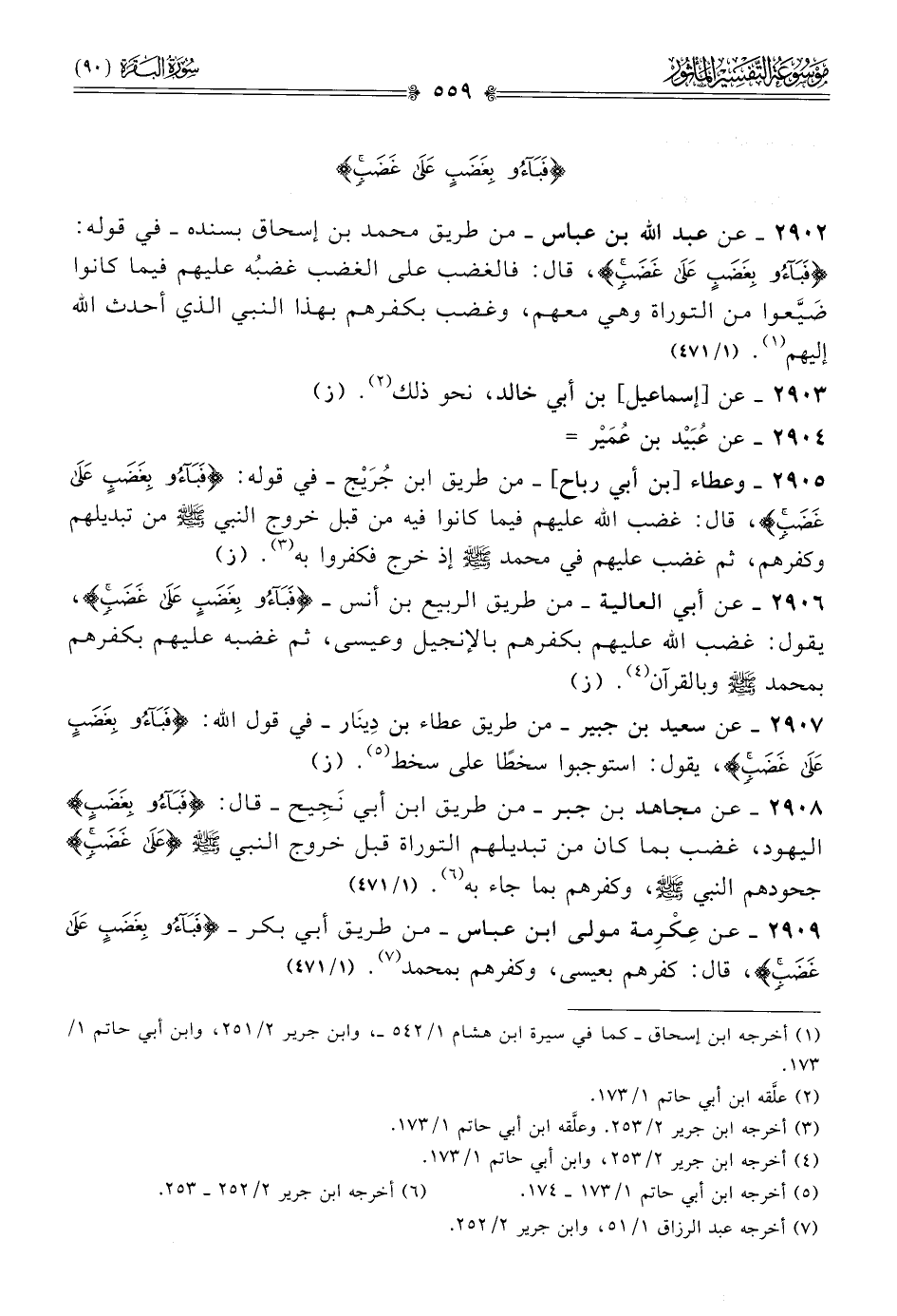 ٢٩٠٨ - عن مجاهد بن جبر -من طريق ابن أبي نَجِيح- قال: {فباءوا بغضب} اليهود، غضب بما كان من تبديلهم التوراة قبل خروج النبي - صلى الله عليه وسلم - {على غضب} جحودهم النبي - صلى الله عليه وسلم -، وكفرهم بما جاء به (¬٦). (١/ ٤٧١)