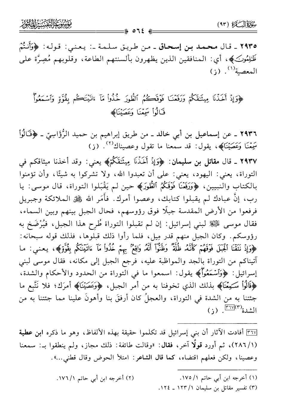 ٢٩٣٧ - قال مقاتل بن سليمان: {وإذ أخذنا ميثاقكم} يعني: وقد أخذنا ميثاقكم في التوراة، يعني: اليهود، يعني: على أن تعبدوا الله، ولا تشركوا به شيئًا، وأن تؤمنوا بالكتاب والنبيين، {ورفعنا فوقكم الطور} حين لم يَقْبَلوا التوراة، قال موسى: يا رب، إنّ عبادك لم يقبلوا كتابك، وعصوا أمرك. فأَمَر الله - عز وجل - الملائكة وجبريل فرفعوا من الأرض المقدسة جبلًا فوق رؤوسهم، فحال الجبل بينهم وبين السماء، فقال موسى - عليه السلام - لبني إسرائيل: إن لم تقبلوا التوراة طُرِح هذا الجبل، فيُرْضَخ به رؤوسكم. وكان الجبل منهم قدر مِيل، فلما رأوا ذلك قبلوها، فذلك قوله سبحانه: {وإذ نتقنا الجبل فوقهم كأنه ظلة وظنوا أنه واقع بهم خذوا ما آتيناكم بقوة}، يعني: ما آتيناكم من التوراة بالجد والمواظبة عليه، فرجع الجبل إلى مكانه، فقال موسى لبني إسرائيل: {واسمعوا} يقول: اسمعوا ما في التوراة من الحدود والأحكام والشدة، {قالوا سمعنا} بذلك الذي تخوفنا به من أمر الجبل، {وعصينا} أمرَك؛ فلا نَتَّبِع ما جئتنا به من الشدة في التوراة، والعجلُ كان أرفقَ بنا وأهونَ علينا مما جئتنا به من الشدة (¬٣) [٣٦٧]. (ز)