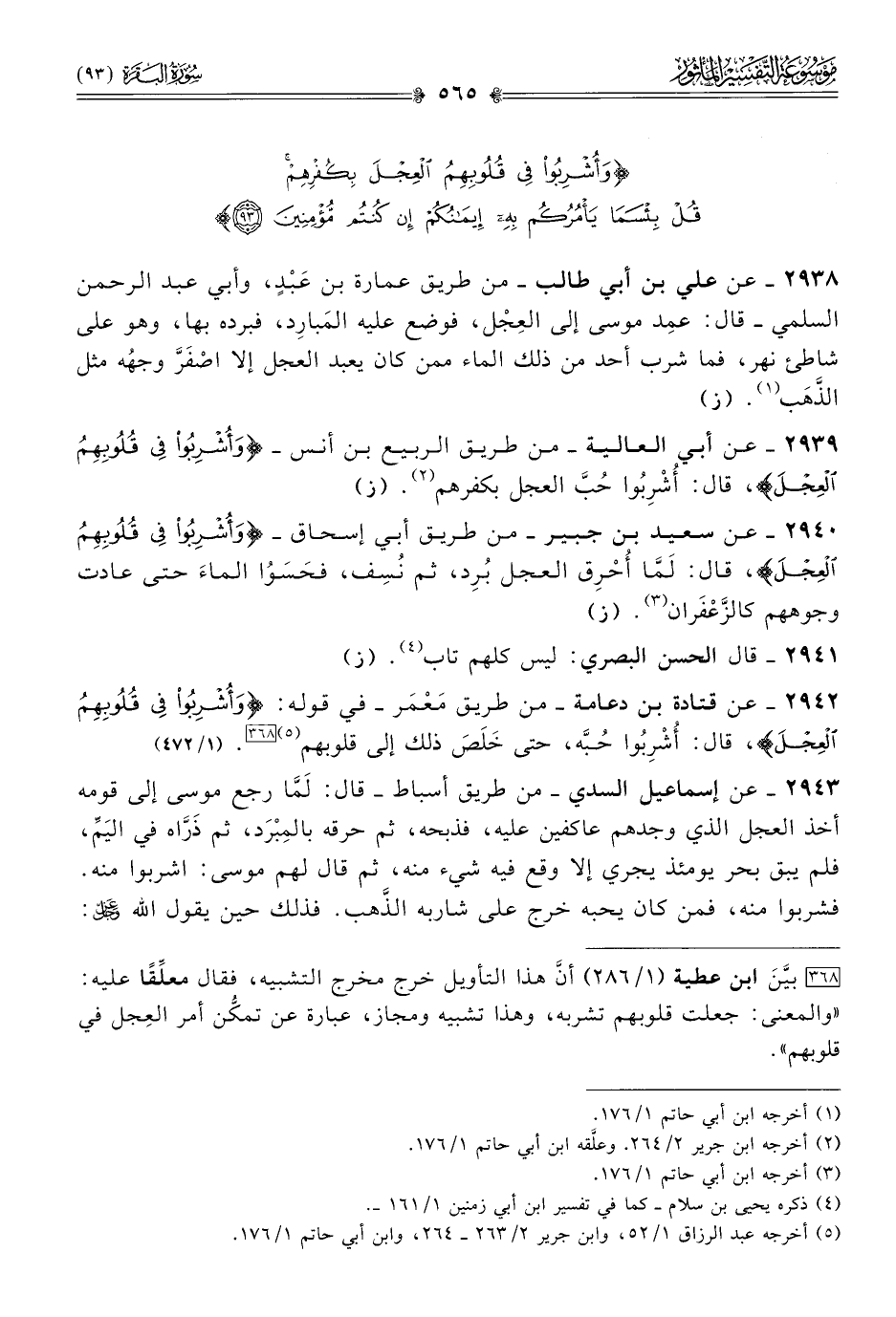 ٢٩٤٢ - عن قتادة بن دعامة -من طريق مَعْمَر- في قوله: {وأشربوا في قلوبهم العجل}، قال: أُشْرِبُوا حُبَّه، حتى خَلَصَ ذلك إلى قلوبهم (¬٥) [٣٦٨]. (١/ ٤٧٢)