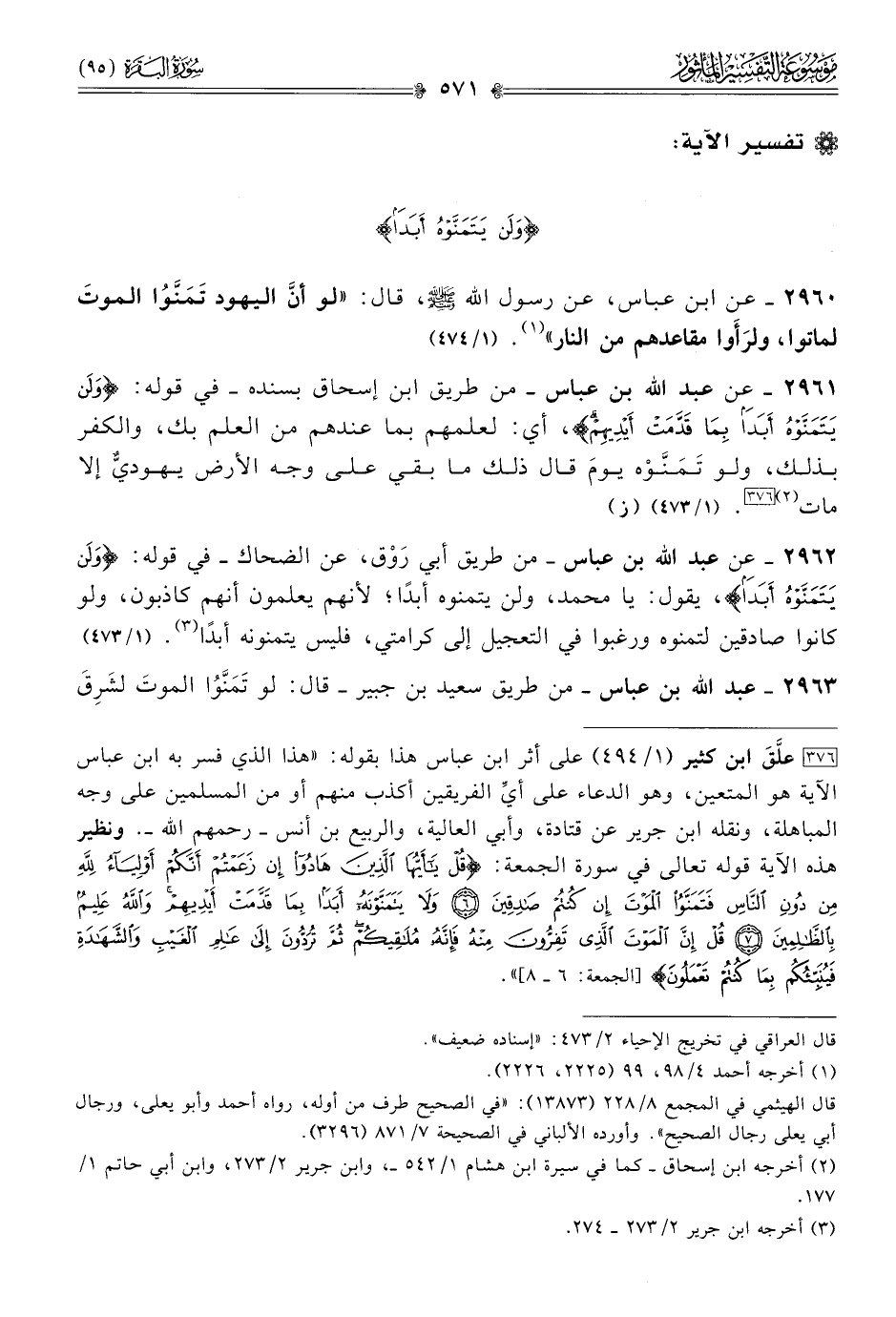 [٣٧٦] علَّقَ ابن كثير (١/ ٤٩٤) على أثر ابن عباس هذا بقوله: «هذا الذي فسر به ابن عباس الآية هو المتعين، وهو الدعاء على أيِّ الفريقين أكذب منهم أو من المسلمين على وجه المباهلة، ونقله ابن جرير عن قتادة، وأبي العالية، والربيع بن أنس -رحمهم الله-. ونظير هذه الآية قوله تعالى في سورة الجمعة: {قل يا أيها الذين هادوا إن زعمتم أنكم أولياء لله من دون الناس فتمنوا الموت إن كنتم صادقين* ولا يتمنونه أبدا بما قدمت أيديهم والله عليم بالظالمين* قل إن الموت الذي تفرون منه فإنه ملاقيكم ثم تردون إلى عالم الغيب والشهادة فينبئكم بما كنتم تعملون} [الجمعة: ٦ - ٨]».