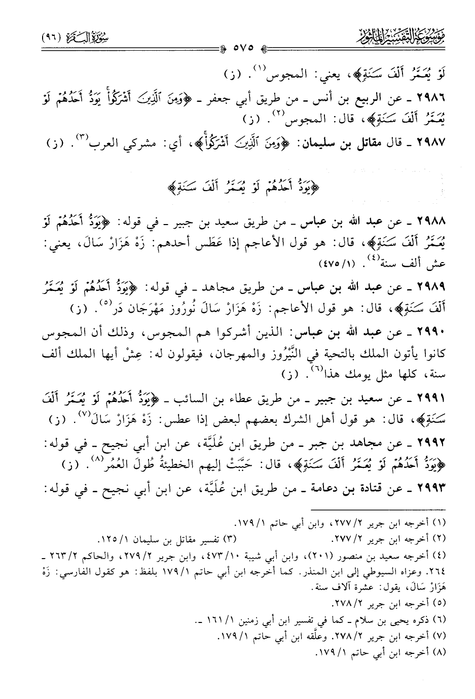 ٢٩٨٨ - عن عبد الله بن عباس -من طريق سعيد بن جبير- في قوله: {يود أحدهم لو يعمر ألف سنة}، قال: هو قول الأعاجم إذا عَطَس أحدهم: زَهْ هَزارْ سالَ، يعني: عش ألف سنة (¬٤). (١/ ٤٧٥)