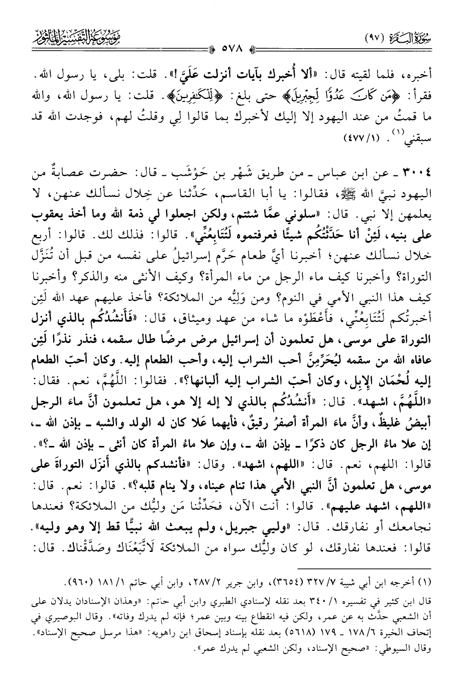 أخبره، فلما لقيته قال: «ألا أُخبرك بآيات أنزلت عَلَيَّ!». قلت: بلى، يا رسول الله. فقرأ: {من كان عدوا لجبريل} حتى بلغ: {للكافرين}. قلت: يا رسول الله، والله ما قمتُ من عند اليهود إلا إليك لأخبرك بما قالوا ِلي وقلتُ لهم، فوجدت الله قد سبقني (¬١). (١/ ٤٧٧)