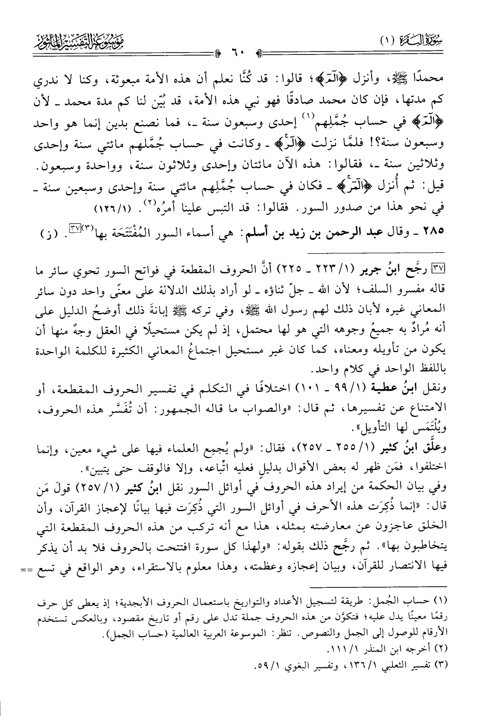 [٣٧] رجَّح ابنُ جرير (١/ ٢٢٣ - ٢٢٥) أنّ الحروف المقطعة في فواتح السور تحوي سائر ما قاله مفسرو السلف؛ لأن الله -جلّ ثناؤه- لو أراد بذلك الدلالة على معنًى واحد دون سائر المعاني غيره لأبان ذلك لهم رسول الله - صلى الله عليه وسلم -، وفي تركه - صلى الله عليه وسلم - إبانةَ ذلك أوضحُ الدليل على أنه مُرادٌ به جميعُ وجوهه التي هو لها محتمل، إذ لم يكن مستحيلًا في العقل وجهٌ منها أن يكون من تأويله ومعناه، كما كان غير مستحيل اجتماعُ المعاني الكثيرة للكلمة الواحدة باللفظ الواحد في كلام واحد.