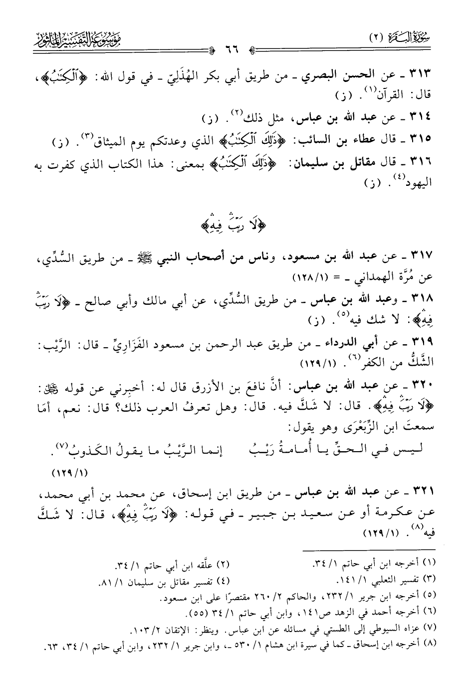 ٣١٨ - وعبد الله بن عباس -من طريق السُّدِّي، عن أبي مالك وأبي صالح- {لا ريب فيه}: لا شك فيه (¬٥). (ز)