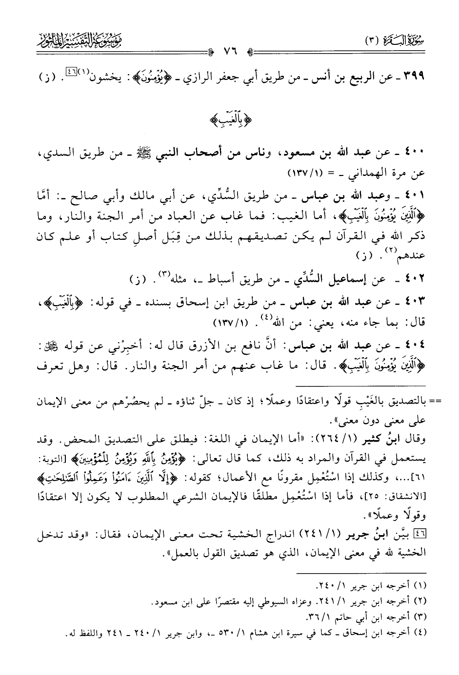 ٤٠٣ - عن عبد الله بن عباس -من طريق ابن إسحاق بسنده- في قوله: {بالغيب}، قال: بما جاء منه، يعني: من الله (¬٤).