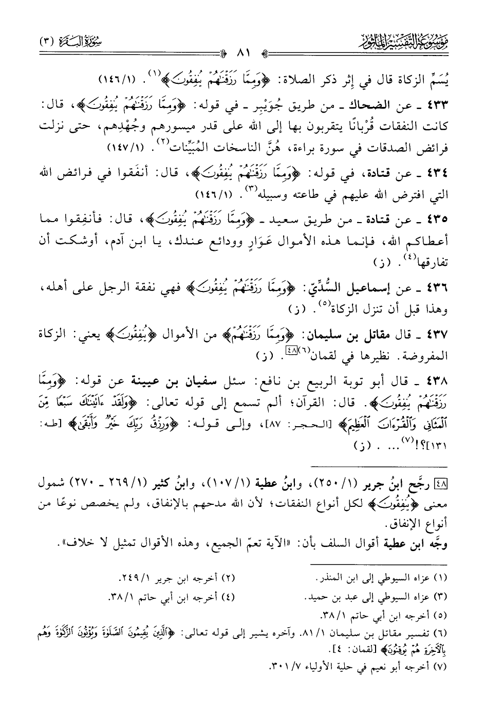 ٤٣٣ - عن الضحاك -من طريق جُوَيْبِر- في قوله: {ومما رزقناهم ينفقون}، قال: كانت النفقات قُرْبانًا يتقربون بها إلى الله على قدر ميسورهم وجُهْدِهم، حتى نزلت فرائض الصدقات في سورة براءة، هُنَّ الناسخات المُبَيِّنات (¬٢). (١/ ١٤٧)