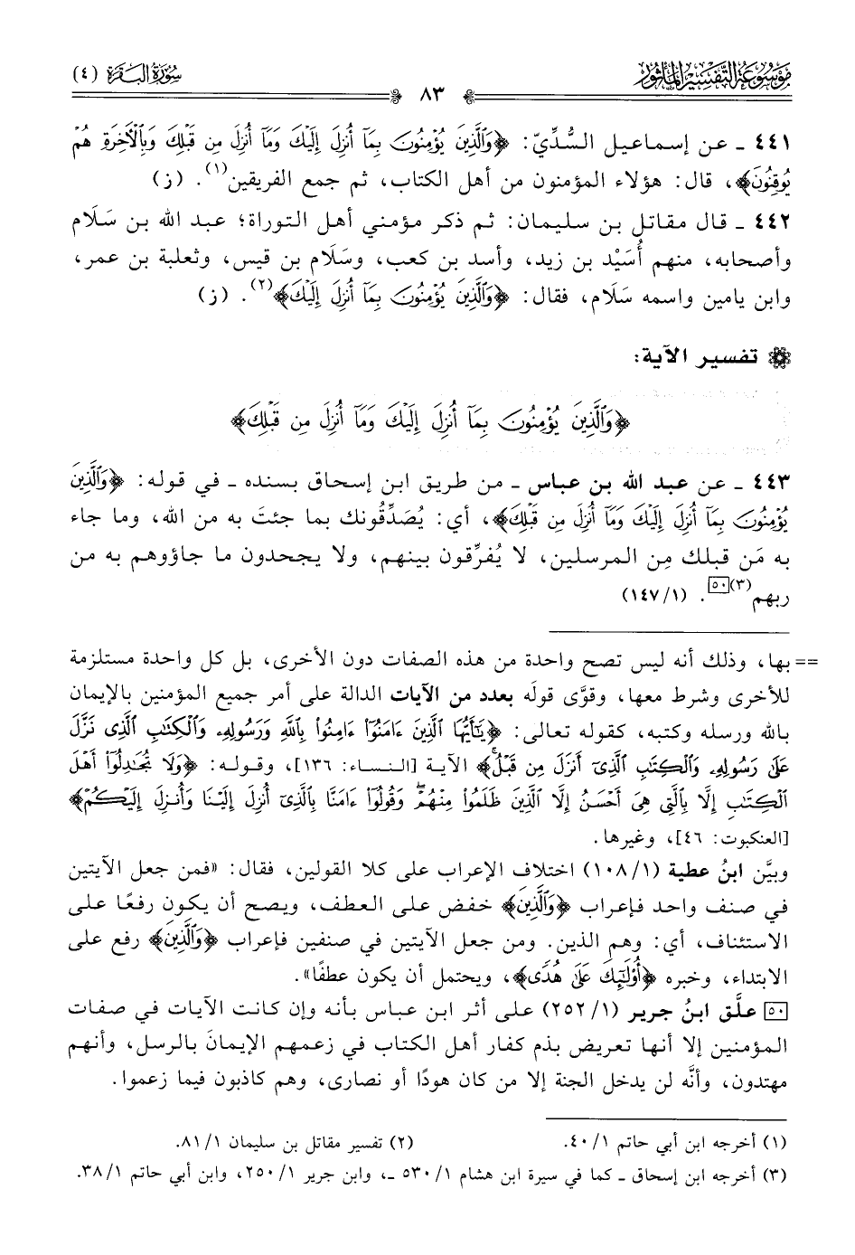 [٥٠] علَّق ابنُ جرير (١/ ٢٥٢) على أثر ابن عباس بأنه وإن كانت الآيات في صفات المؤمنين إلا أنها تعريض بذم كفار أهل الكتاب في زعمهم الإيمانَ بالرسل، وأنهم مهتدون، وأنّه لن يدخل الجنة إلا من كان هودًا أو نصارى، وهم كاذبون فيما زعموا.