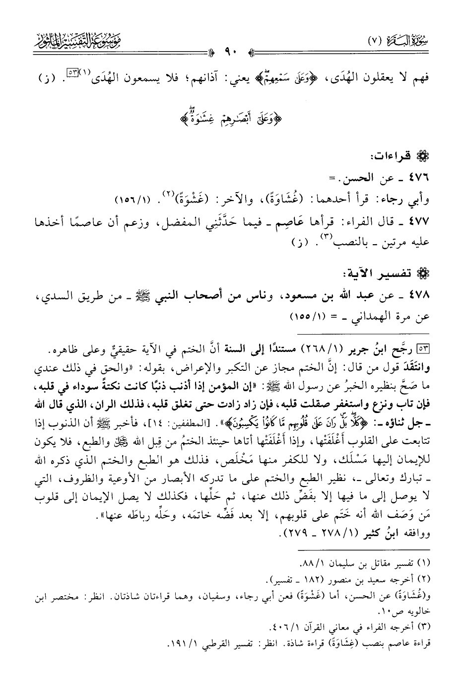 [٥٣] رجَّح ابنُ جرير (١/ ٢٦٨) مستندًا إلى السنة أنّ الختم في الآية حقيقيٌّ وعلى ظاهره.