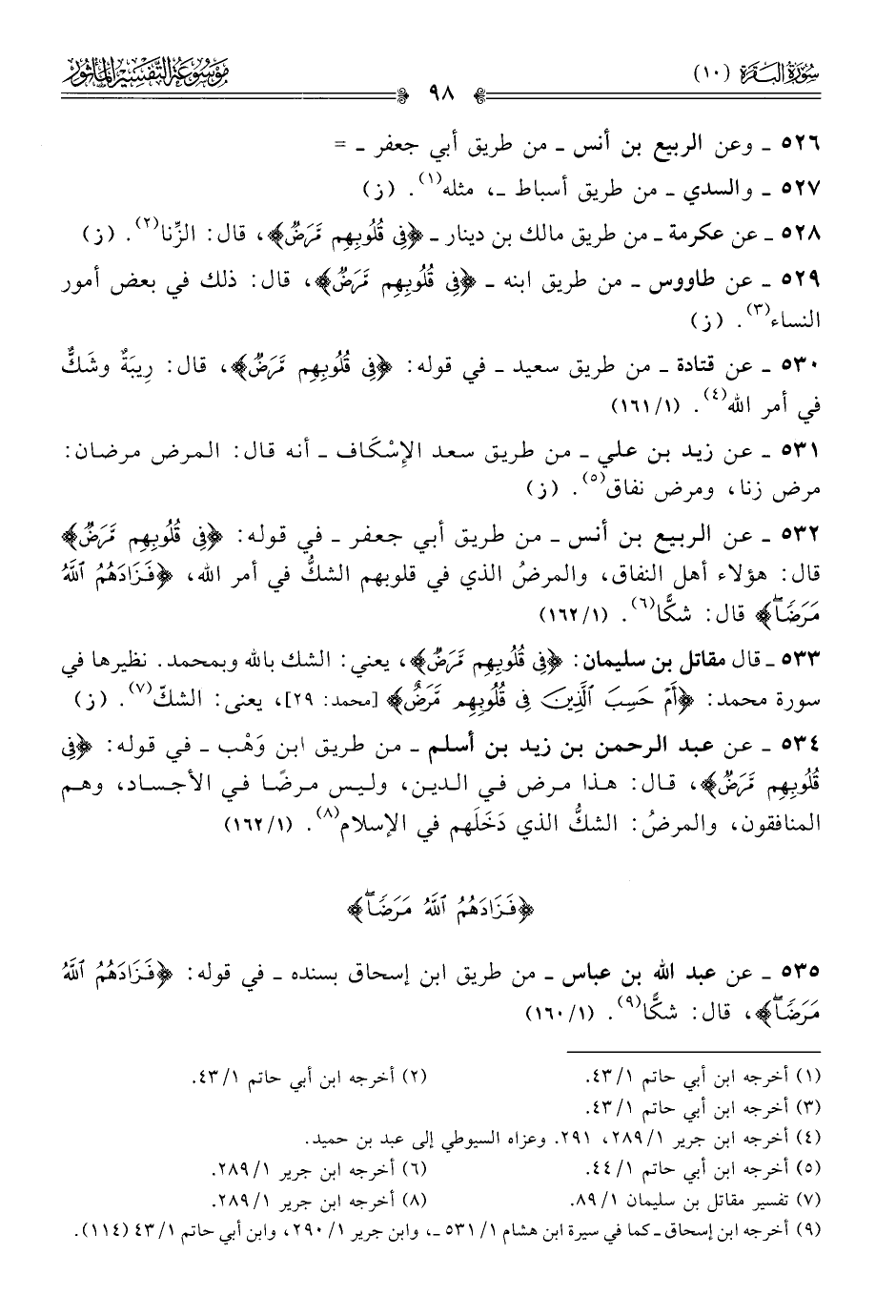 ٥٣٢ - عن الربيع بن أنس -من طريق أبي جعفر- في قوله: {في قلوبهم مرض} قال: هؤلاء أهل النفاق، والمرضُ الذي في قلوبهم الشكُّ في أمر الله، {فزادهم الله مرضا} قال: شكًّا (¬٦). (١/ ١٦٢)