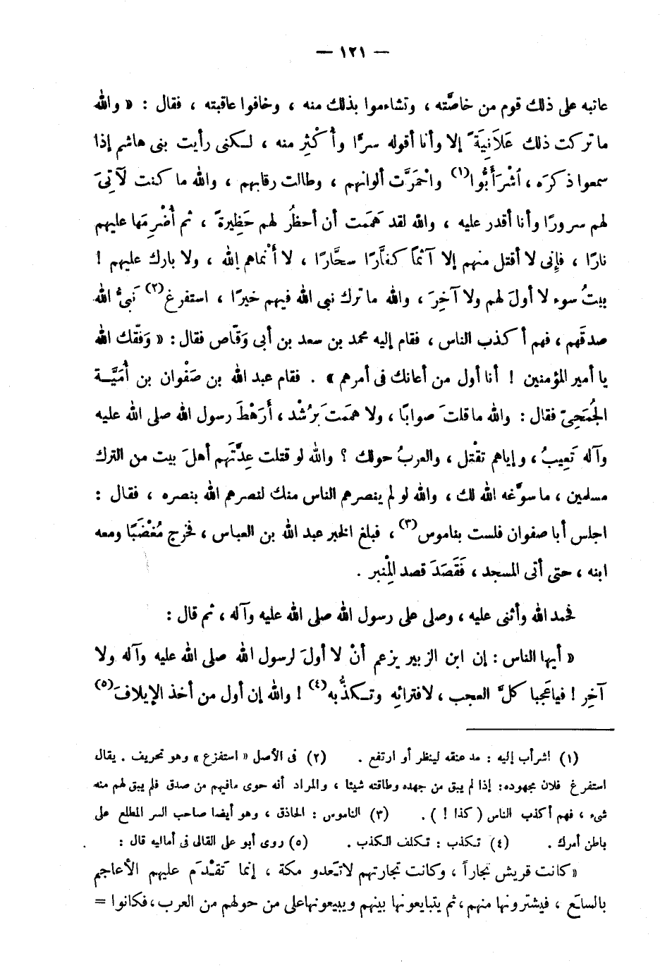 عاتبه على ذلك قوم من خاصته، وتشاءموا بذلك منه، وخافوا عاقبته، فقال: "والله ما تركت ذلك علانية إلا وأنا أقوله سرًّا وأكثر منه، لكني رأيت بني هاشم إذا سمعوا ذكره، اشرأبوا1 واحمرت ألوانهم، وطالت رقابهم، والله ما كنت لآتي لهم سرورًا وأنا أقدر عليه، والله لقد هممت أن أحظر لهم حظيرة، ثم أضرمها عليهم نارًا، فإني لا أقتل منهم إلا آثمًا كفارًا سحارًا، لا أنماهم الله، ولا بارك عليهم! بيت سوء لا أول لهم ولا آخر، والله ما ترك نبي الله فيهم خيرًا، استفرغ2 نبي الله صدقهم، فهم أكذب الناس، فقام إليه محمد بن سعد بن أبي وقاص فقال: "وفقك الله يا أمير المؤمنين! أنا أول من أعانك في أمرهم". فقام عبد الله بن صفوان بن أمية الجمحي فقال: والله ما قلت صوابًا، ولا هممت برشد، أرهط رسول الله صَلَّى اللَّهُ عَلَيْهِ وَآلِهِ تعيب، وإياهم تقتل، والعرب حولك؟ والله لو قتلت عدتهم أهل بيت من الترك مسلمين، ما سوَّغَهُ الله لك، والله لو لم ينصرهم الناس منك لنصرهم الله بنصره، فقال: اجلس أبا صفوان فلست بناموس3، فبلغ الخبر عبد الله بن العباس، فخرج مغضبًا ومعه ابنه، حتى أتى المسجد، فقصد قصد المنبر.
