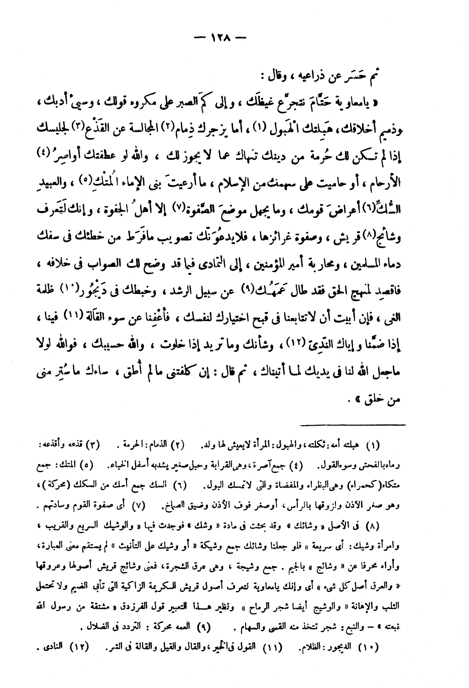 8 في الأصل "وشاتك" وقد بحثت في مادة "وشك" فوجدت فيها "والوشيك السريع والقريب، وامرأة وشيك: أي سريعة" فلو جعلنا وشائك جمع وشيكة "أو وشيك على التأنيث" لم يستقم معنى العبارة، وأراه محرفًا عن "وشائج" بالجيم. جمع وشيجة، وهي عرق الشجرة، فمعنى وشائج قريش أصولها وعروقها "والعرق أصل كل شيء" أي وإنك يا معاوية لتعرف أصول قريش الكريمة الزاكية التي تأبى الضيم ولا تحتمل الثلب والإهانة "والوشيج أيضًا شجر الرماح" ونظير هذا التعبير قول الفرزدق "مشتقة من رسول الله نبعته" – والنبع: شجر تتخذ منه القمى والسهام.