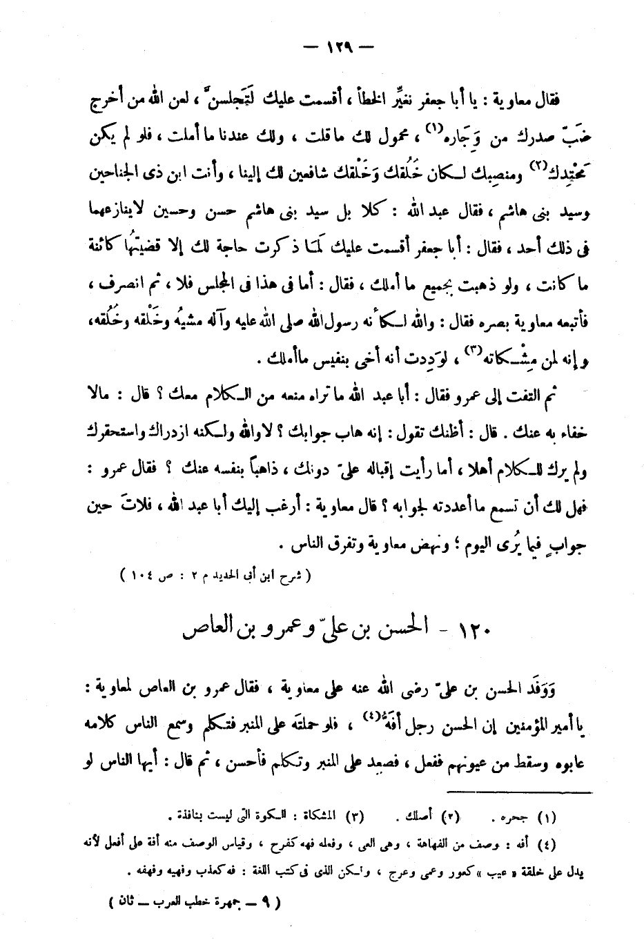 ثم التفت إلى عمرو فقال: أبا عبد الله ما تراه منعه من الكلام معك؟ قال: ما لا خفاء به عنك. قال: أظنك تقول: إنه هاب جوابك؟ لا والله ولكنه ازدراك واستحقرك ولم يرك للكلام أهلا، أما رأيت إقباله علي دونك، ذاهبا بنفسه عنك؟ فقال عمرو: فهل لك أن تسمع ما أعددته لجوابه؟ قال معاوية: أرغب إليك أبا عبد الله، فلات حين جوابٍ فيما يُرى اليوم؛ ونهض معاوية وتفرق الناس.