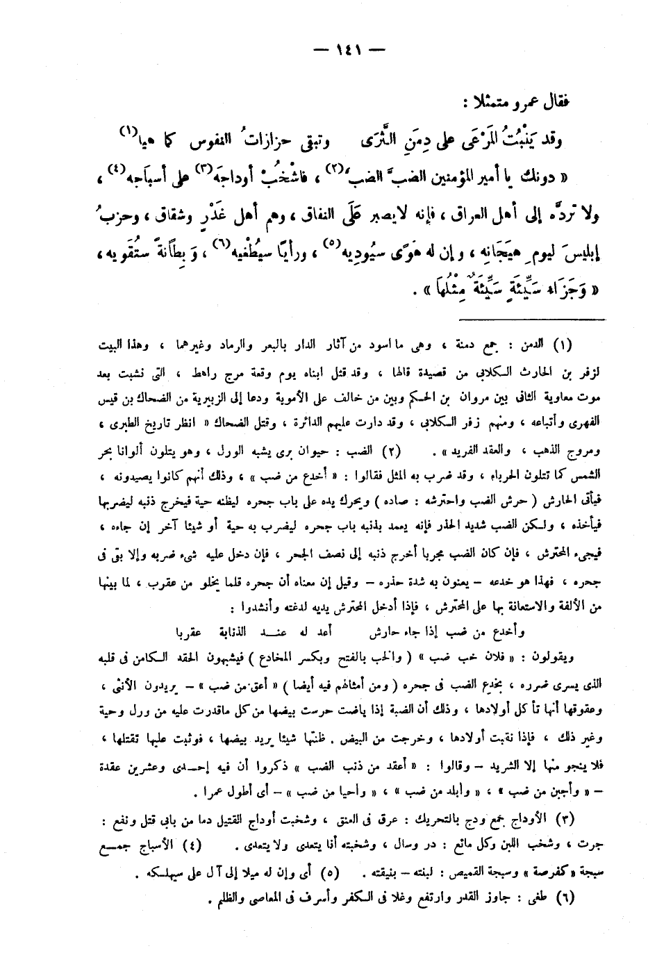 1 الدمن: جمع دمنة، وهي ما اسود من آثار الدار بالبعر والرماد وغيرهما، وهذا البيت لزفر بن الحارث الكلابي من قصيدة قالها، وقد قتل ابناه يوم وقعة مرج راهط، التي نشبت بعد موت معاوية الثاني بين مروان بن الحكم وبين من خالف على الأموية ودعا إلى الزبيرية من الضحاك بن قيس الفهري وأتباعه، ومنهم زفر الكلابي، وقد دارت عليهم الدائرة، وقتل الضحاك "انظر تاريخ الطبري، ومروج الذهب، والعقد الفريد".