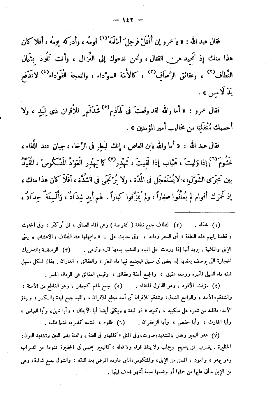 فقال عبد الله: "أما والله يابن العاص، إنك لبطر في الرخاء، جبان عند اللقاء، غَشُومٌ6 إذا وليت، هياب إذا لَقِيتَ، تهدر7 كما يهدر العود المنكوس، المقيد بين مجرى الشول، لا يستعجل في المدة، ولا يرتجى في الشدة، أفلا كان هذا منك، إذا غمرك أقوام لم يعنفوا صغارًا، ولم يمزقوا كبارًا. لهم أيد شداد، وألسنة حداد،
