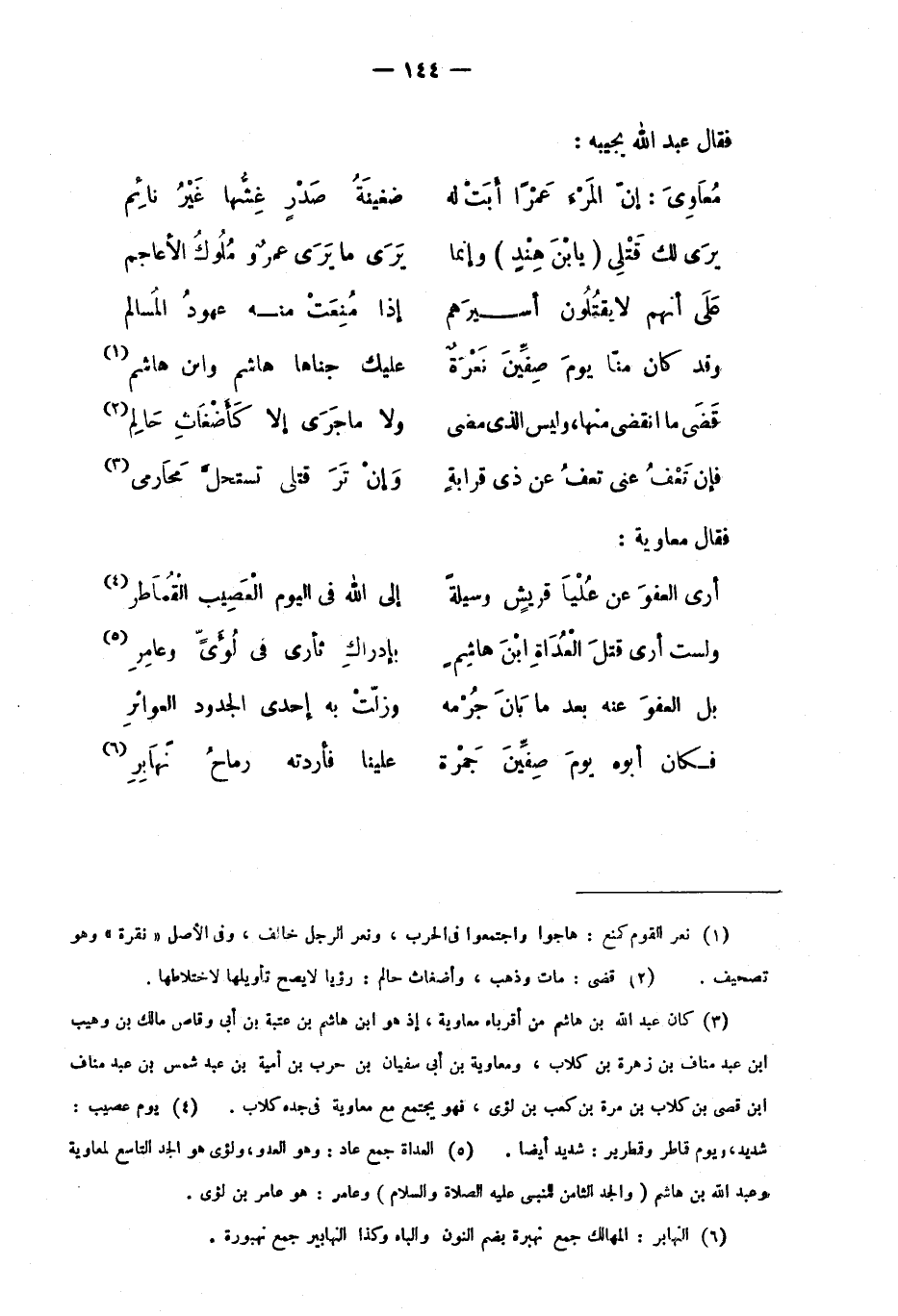 5 العداة جمع عاد: وهو العدو، ولؤي هو الجد التاسع لمعاوية وعبد الله بن هاشم "والجد الثامن للنبي عليه الصلاة والسلام" وعامر: هو عامر بن لؤي.