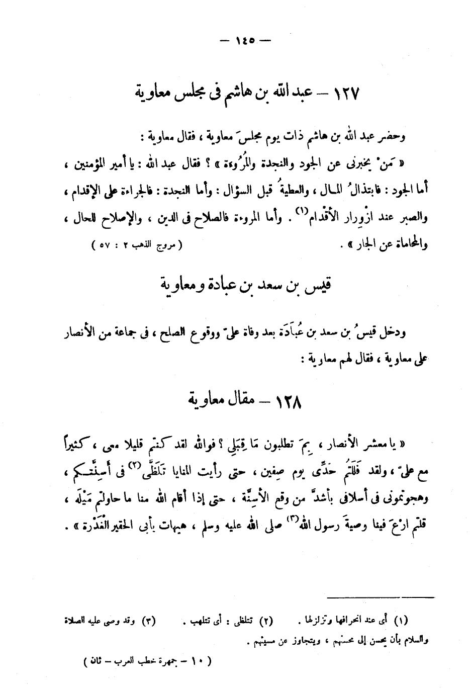 "من يخبرني عن الجود والنجدة والمروءة"؟ فقال عبد الله: يا أمير المؤمنين، أما الجود: فابتذال المال، والعطية قبل السؤال: وأما النجدة: فالجراءة على الإقدام، والصبر عند ازورار الأقدام1. وأما المروءة فالصلاح في الدين، والإصلاح للحال، والمحاماة عن الجار".