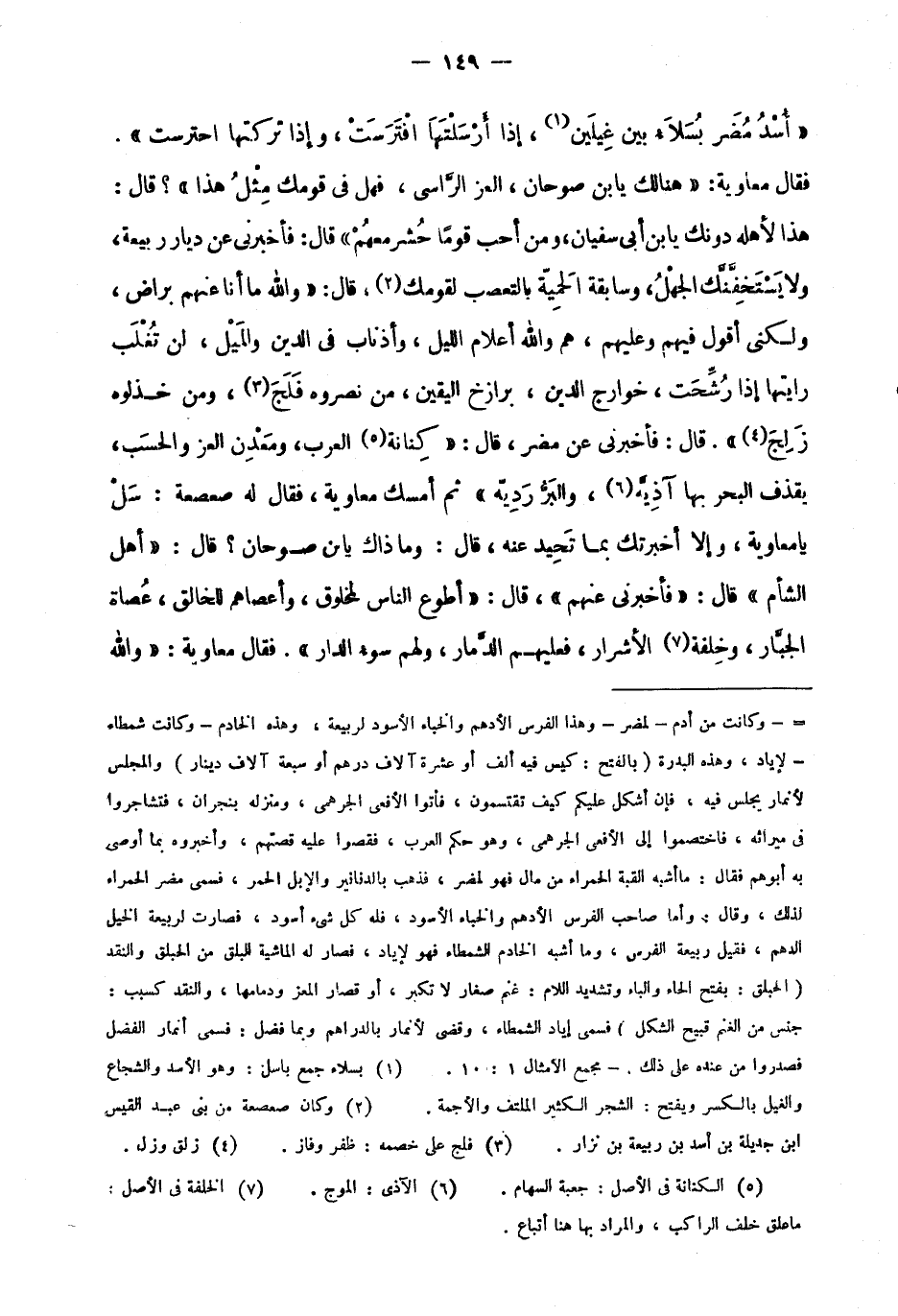 فقال معاوية: "هنالك يابن صوحان، العز الراسي، فهل في قومك مثل هذا"؟ قال: هذا لأهله دونك يابن أبي سفيان، ومن أحب قومًا حشر معهم" قال: فأخبرني عن ديار ربيعة، ولا يستخفنك الجهل، وسابقة الحمية بالتعصب لقومك2، قال: "والله ما أنا عنهم براض، ولكني أقول فيهم وعليهم، هم والله أعلام الليل، وأذناب في الدين والميل، لن تغلب رايتها إذا رشحت، خوارج الدين، برازخ اليقين، من نصروه فلج3، ومن خذلوه زلج4". قال: فأخبرني عن مضر، قال: "كنانة5 العرب، ومعدن العز والحسب، يقذف البحر بها آذيَّه6، والبر رديه" ثم أمسك معاوية، فقال له صعصعة: سل يا معاوية، وإلا أخبرتك بما تحيد عنه، قال: وما ذاك يابن صوحان؟ قال: "أهل الشام" قال: "فأخبرني عنهم"، قال: "أطوع الناس لمخلوق، وأعصاهم للخالق، عصاة الجبار، وخلفة7 الأشرار، فعليهم الدمار، ولهم سوء الدار". فقال معاوية: "والله