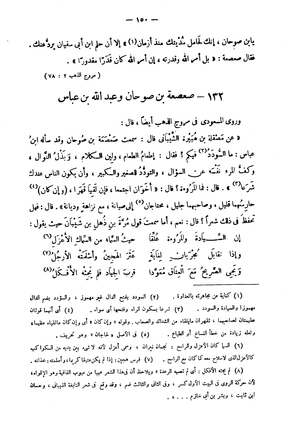 "عن مصقلة بن هبيرة الشيباني قال: سمعت صعصعة وقد سأله ابن عباس: ما السؤدد1 فيكم؟ فقال: إطعام الطعام، ولين الكلام، وبذل النوال، وكف المرء نفسه عن السؤال، والتودد للصغير والكبير، وأن يكون الناس عندك شرعا2" قال: فما المروءة؟ قال: "أخوان اجتمعا، فإن لقيا قَهَرا، "وإن كان"3 حارسهما قليل، وصاحبهما جليل، محتاجان4 إلى صيانة، مع نزاهة وديانة" قال: فهل تحفظ في ذلك شعرًا؟ قال: نعم، أما سمعت قول مرة بن ذهل بن شيبان حيث يقول: